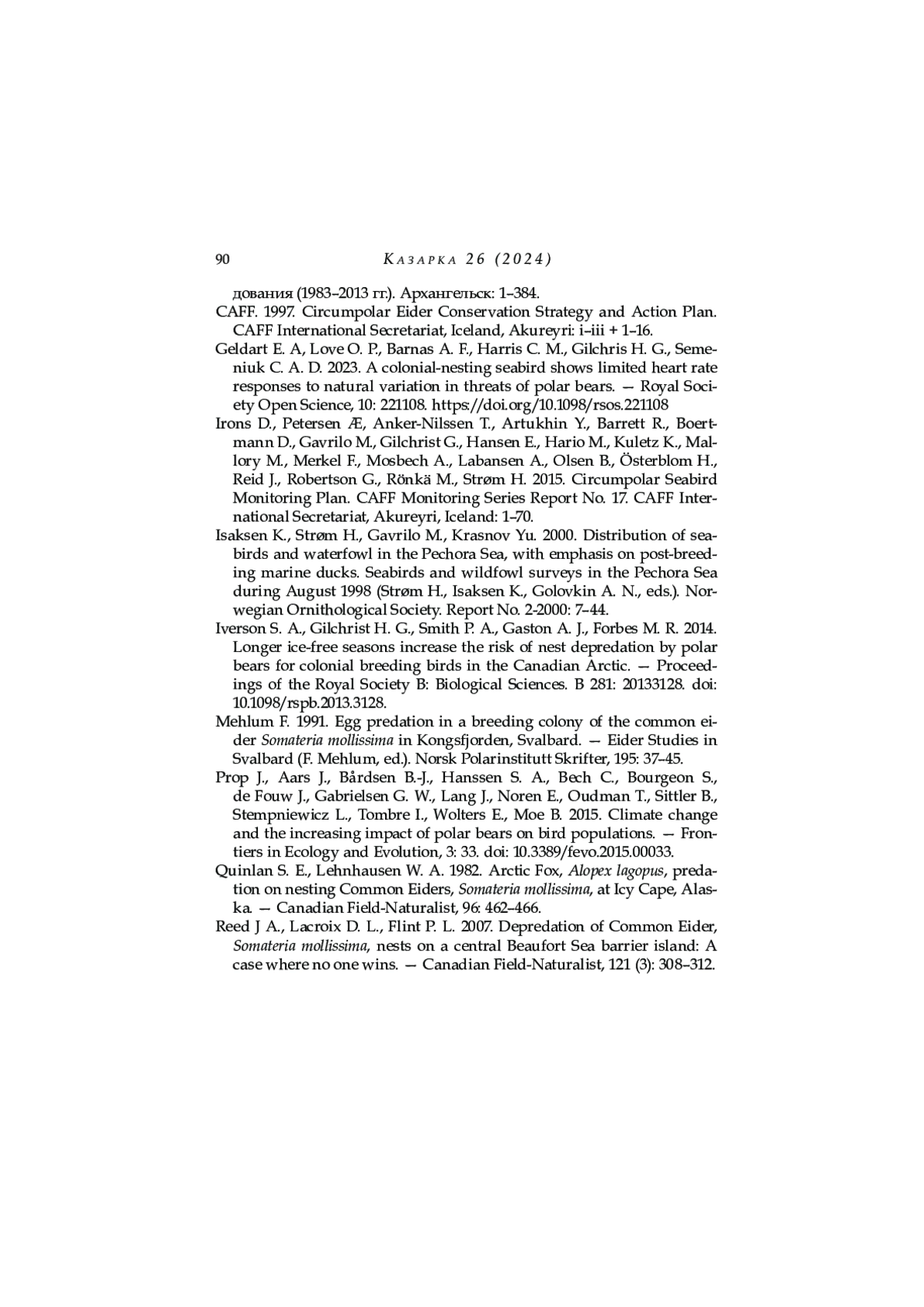 31. Geldart E. A, Love O. P., Barnas A. F., Harris C. M., Gilchris H. G., Semeniuk C. A. D. 2023 A colonial-nesting seabird shows limited heart rate responses to natural variation in threats of polar bears. - Royal Society Open Science, 10: 221108. DOI: 10.1098/rsos.221108