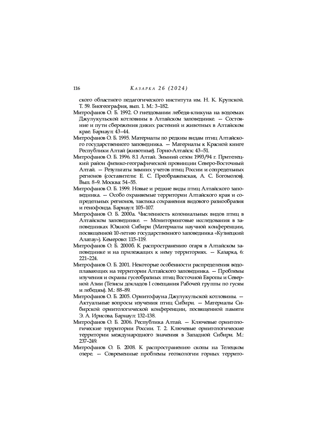 23. Митрофанов О. Б. 2013. Зимуюшие виды птиц Алтайского заповедника. - Природные комплексы Северного Прибайкалья. Труды Баргузинского государственного природного биосферного заповедника. Вып. 10. Улан-Удэ: 115-128.