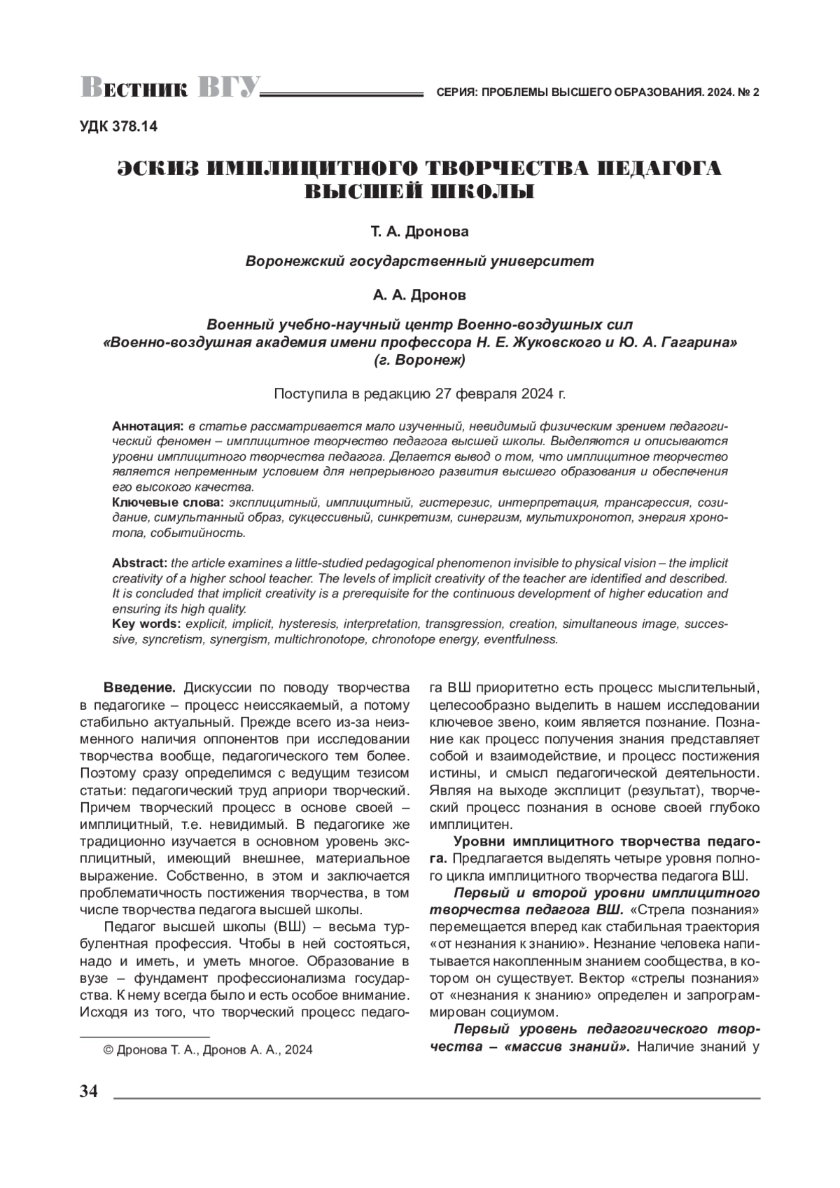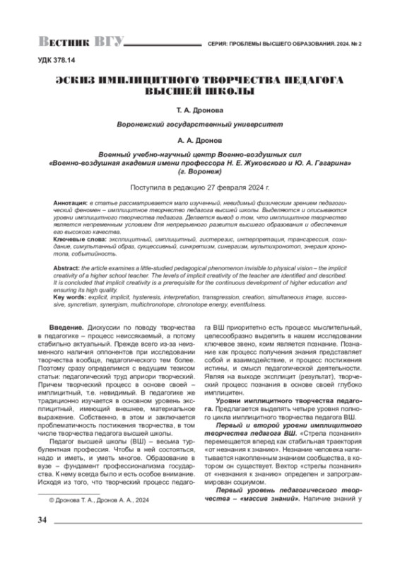 ДРОНОВ А. А., ДРОНОВА Т. А. ЭСКИЗ ИМПЛИЦИТНОГО ТВОРЧЕСТВА ПЕДАГОГА ВЫСШЕЙ ШКОЛЫ // ВЕСТНИК ВОРОНЕЖСКОГО ГОСУДАРСТВЕННОГО УНИВЕРСИТЕТА. СЕРИЯ: ПРОБЛЕМЫ ВЫСШЕГО ОБРАЗОВАНИЯ. 2024. № 2