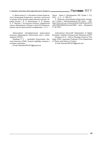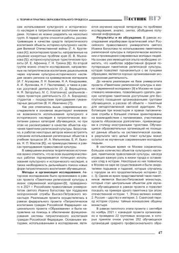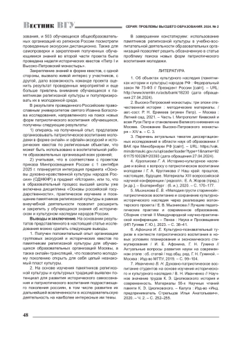 ЕРЕМЕЕВ Р. Н. ПАМЯТНИКИ РЕЛИГИОЗНОЙ КУЛЬТУРЫ В ПАТРИОТИЧЕСКОМ ВОСПИТАНИИ ОБУЧАЮЩИХСЯ // ВЕСТНИК ВОРОНЕЖСКОГО ГОСУДАРСТВЕННОГО УНИВЕРСИТЕТА. СЕРИЯ: ПРОБЛЕМЫ ВЫСШЕГО ОБРАЗОВАНИЯ. 2024. № 2