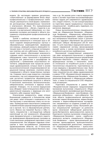 Третий и наиболее системный вызов – это внутренние возможности и потенциал вуза в области создания междисциплинарных научных и образовательных взаимодействий, формирование команды, умеющей раскрыть имеющийся потенциал вуза и построить успешную мотивационную политику для его работников. Именно это, с нашей точки зрения, обеспечивает возможность создания нового технологического и экспертного оборудования, новых технологий и программных продуктов для диагностики и расшифровки ее результатов с применением искусственного интеллекта, цифровизации всех процессов организации здравоохранения, которые лежат в основе высокотехнологической специализированной медицинской помощи населению, стратегии импортозамещения в области лекарственных препаратов. Создание такого рода продуктов и программ, несомненно, под силу медицинским вузам, имеющим достаточно продвинутые образовательные и материально-технические мощности в области IT-технологий, генетических, биотехнологических, кибернетических, оптических и ядерных исследований. Очевидно, что не многие медицинские вузы обладают таким потенциалом в области фундаментальной медицины и фармации или могут позволить себе создание такой базы.