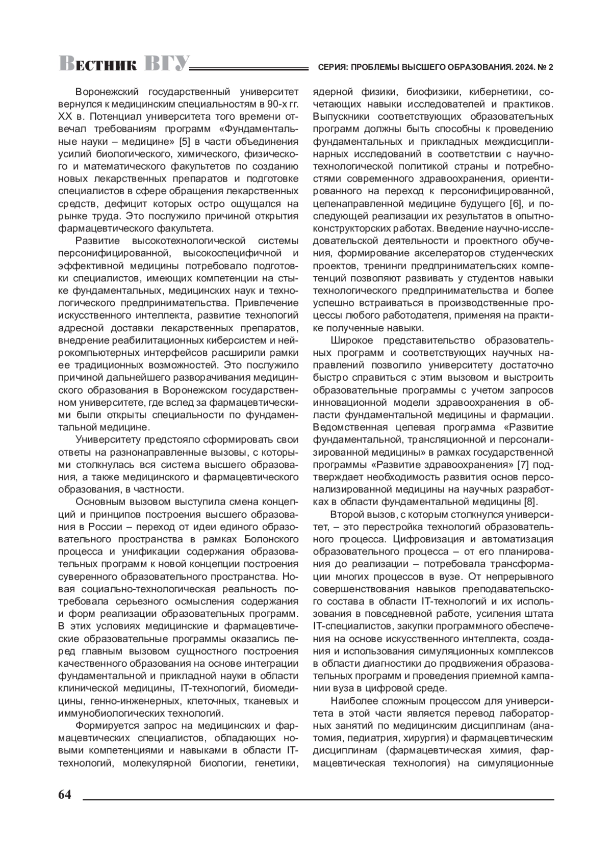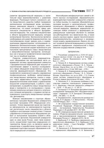 Рассмотрены основные тенденции и предпосылки развития медицинского образования в классических университетах на примере Воронежского государственного университета. Отражена значимость междисциплинарного подхода и интеграции фундаментальной и прикладной науки при подготовке специалистов в области фундаментальной медицины и фармации.