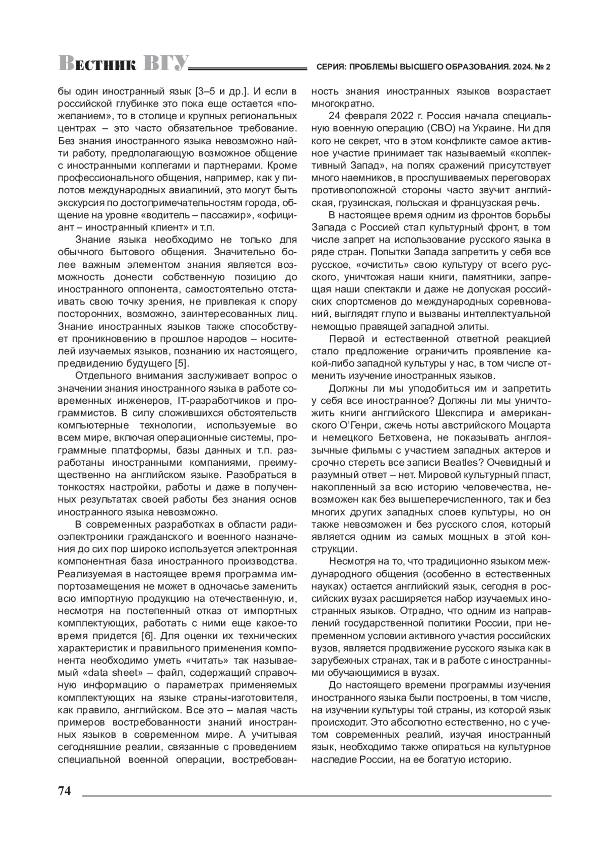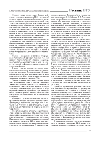 В статье рассматривается вопрос о важности изучения иностранного языка в условиях проведения специальной военной операции (СВО). Обсуждаются такие вопросы, как иностранный язык - обязательная дисциплина в рамках среднего и высшего образования, отношение к иностранной культуре, в том числе языковой культуре в период СВО и необходимость изучения иностранного языка в современных реалиях.