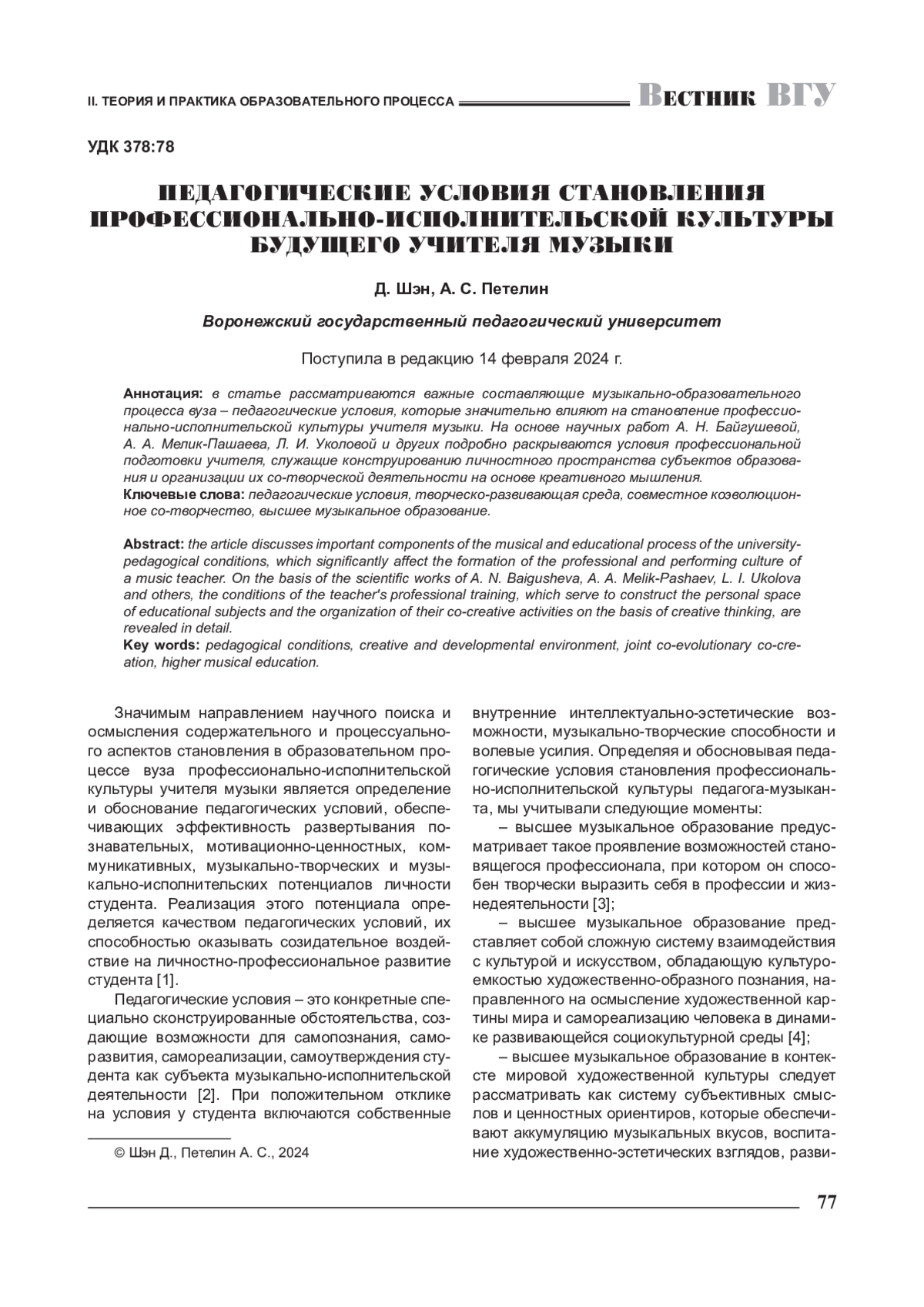 2. Сунь Ю. Освоение русской музыкальной культуры иностранными студентами в процессе музыкально-педагогического образования / Ю. Сунь, А. С. Петелин. - Воронеж: ВГПУ, 2018. - 172 с.