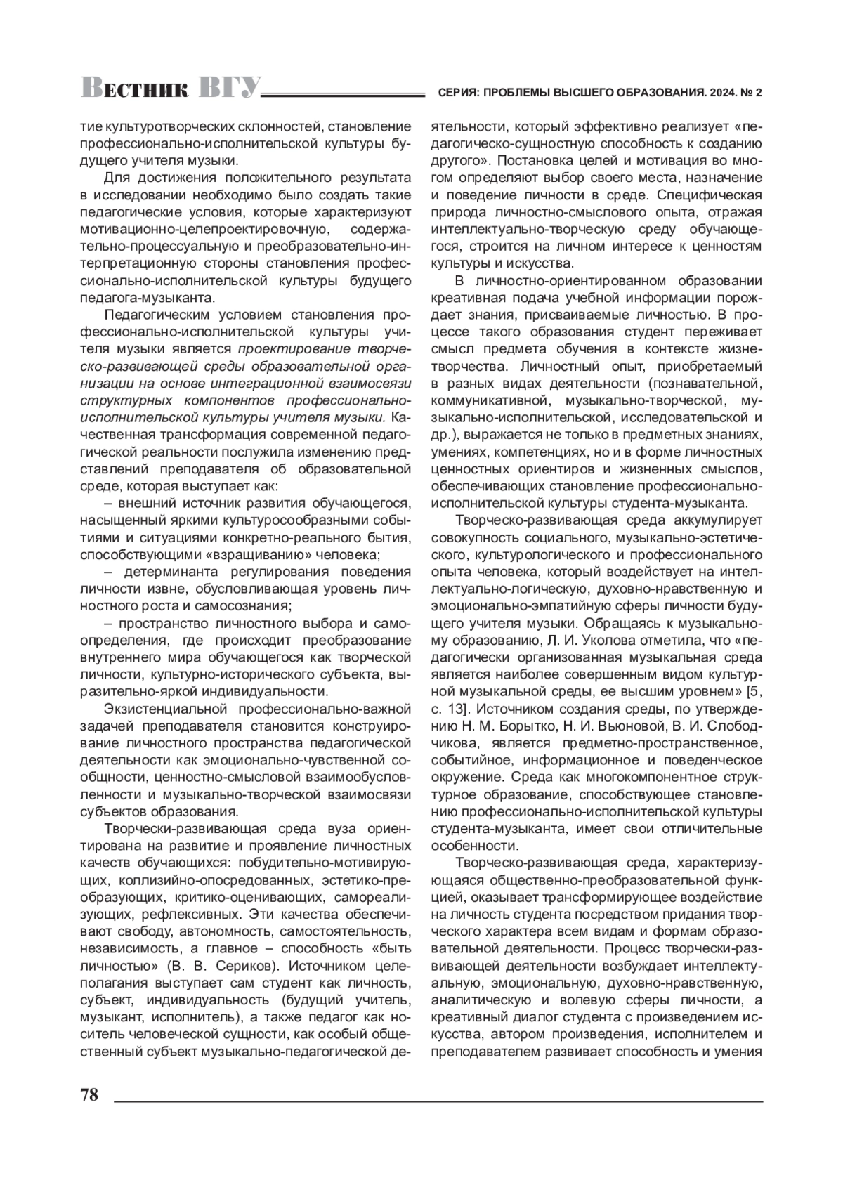 Эффективность становления в вузе профессионально-исполнительской культуры будущего учителя музыки зависит не только от конкретных музыкальных, интеллектуальных, коммуникативных, исследовательских качеств личности студента как субъекта музыкального исполнительства, но и от теоретико-методологических представлений о том, как синхронизировать коэволюционное сотворчество студента (освоение музыкальной информации, декодирование содержания музыкального произведения, перевод исполнительской техники в сценическую интерпретацию, формирование артистизма и др.) и преподавателя (педагогическая организация профессионально-учебного действия, педагог как субъект культуры и культурно-образного творения музыкального сочинения, оценивающий и коррелирующий собственную деятельность и деятельность студента и др.).