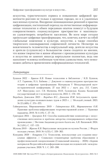 2. Воробьев, Довгалюк 2023 - Воробьев И.С., Довгалюк И.М. Актуальность проведения культурно-познавательных туров в 2023 г. // Молодой ученый. 2023. № 22 (469). С. 374-375.