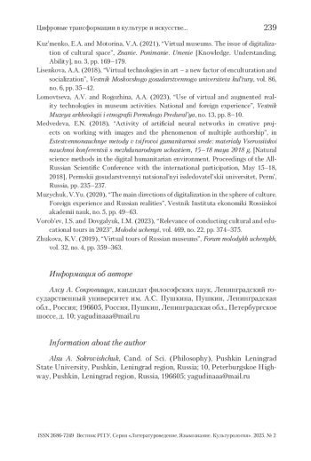 9. Ломовцева, Рогожина 2023 - Ломовцева А.В., Рогожина А.А. Использование технологий виртуальной и дополнительной реальности в деятельности музеев: отечественный и зарубежный опыт // Вестник Музея археологии и этнографии Пермского Предуралья. 2023. № 13. С. 8-10.