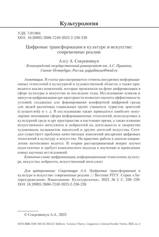 В статье рассматривается степень внедрения информационных технологий в культурной и художественной области, а также приводится анализ изменений, которые произошли на фоне цифровизации в сфере культуры и искусства за последние годы. Исследование плюсов и минусов цифровизации арт пространств позволит оценить эффективность условий, созданных для формирования комфортной цифровой среды для людей различных социальных групп: учащихся, туристов, зрителей (слушателей) и т. д. В исследовании также приводятся наиболее популярные инновации сферы информационных технологий, используемых в культурной среде и арт пространстве в настоящее время, а также влияние искусственного интеллекта и нейросетей на деятельность и творчество художников, музыкантов, писателей и других деятелей искусства. Сегодня существует проблема качественных изменений внедрения цифровых технологий в культуру и искусство. На практике работа в данном направлении интенсивно ведется. В теории рассматриваемый вопрос изучен недостаточно и требует комплексного подхода к изучению и проведения новых научных исследований.