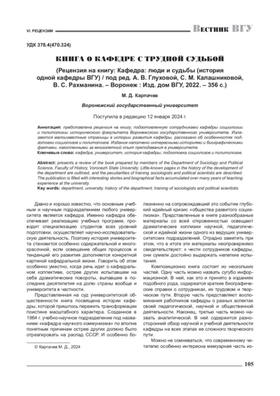 Представлена рецензия на книгу, подготовленную сотрудниками кафедры социологии и политологии исторического факультета Воронежского государственного университета. Излагаются малоизвестные страницы в истории развития кафедры, рассказано об особенностях подготовки социологов и политологов. Издание наполнено интересными историями и биографическими фактами, накопленными за многолетний опыт преподавания в университете.