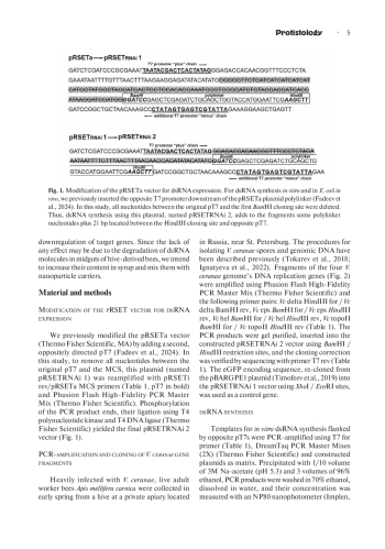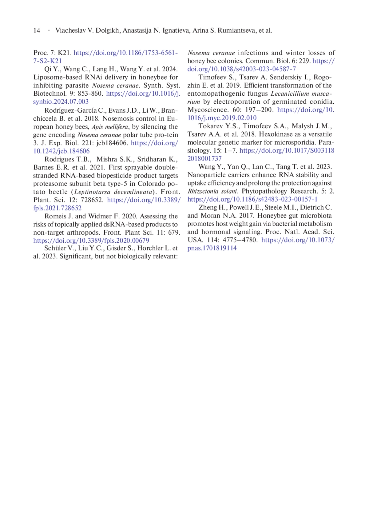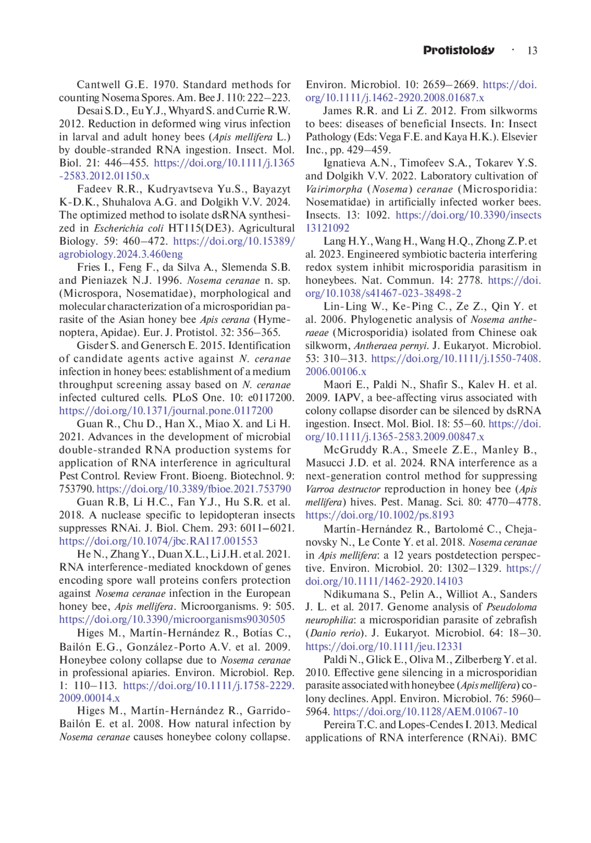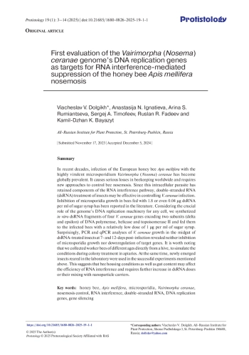 ДОЛГИХ В. В., IGNATIEVA A.N., RUMIANTSEVA A.S., TIMOFEEV S.A., FADEEV R.R., BAYAZYT K.D.K. FIRST EVALUATION OF THE VAIRIMORPHA (NOSEMA) CERANAE GENOME’S DNA REPLICATION GENES AS TARGETS FOR RNA INTERFERENCE-MEDIATED SUPPRESSION OF THE HONEY BEE APIS MELLIFERA NOSEMOSIS // PROTISTOLOGY. 2025. № 1, ТОМ 19