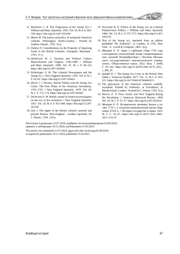 21. Макаров Е. П. Закон о гербовом сборе 1765 года в восприятии политической нации североамериканских колоний Великобритании // Вестник Московского государственного лингвистического университета. Общественные науки. 2022. Вып. 1 (846). С. 95-102. DOI: 10.52070/2500-347X_2022_1_846_95 EDN: PVWGQD