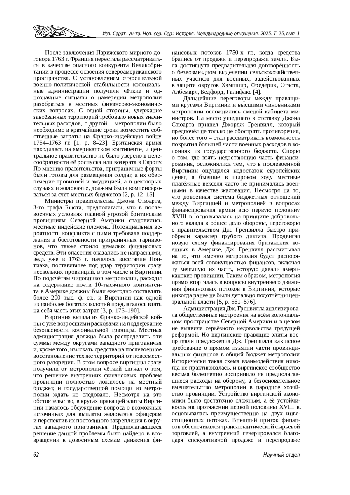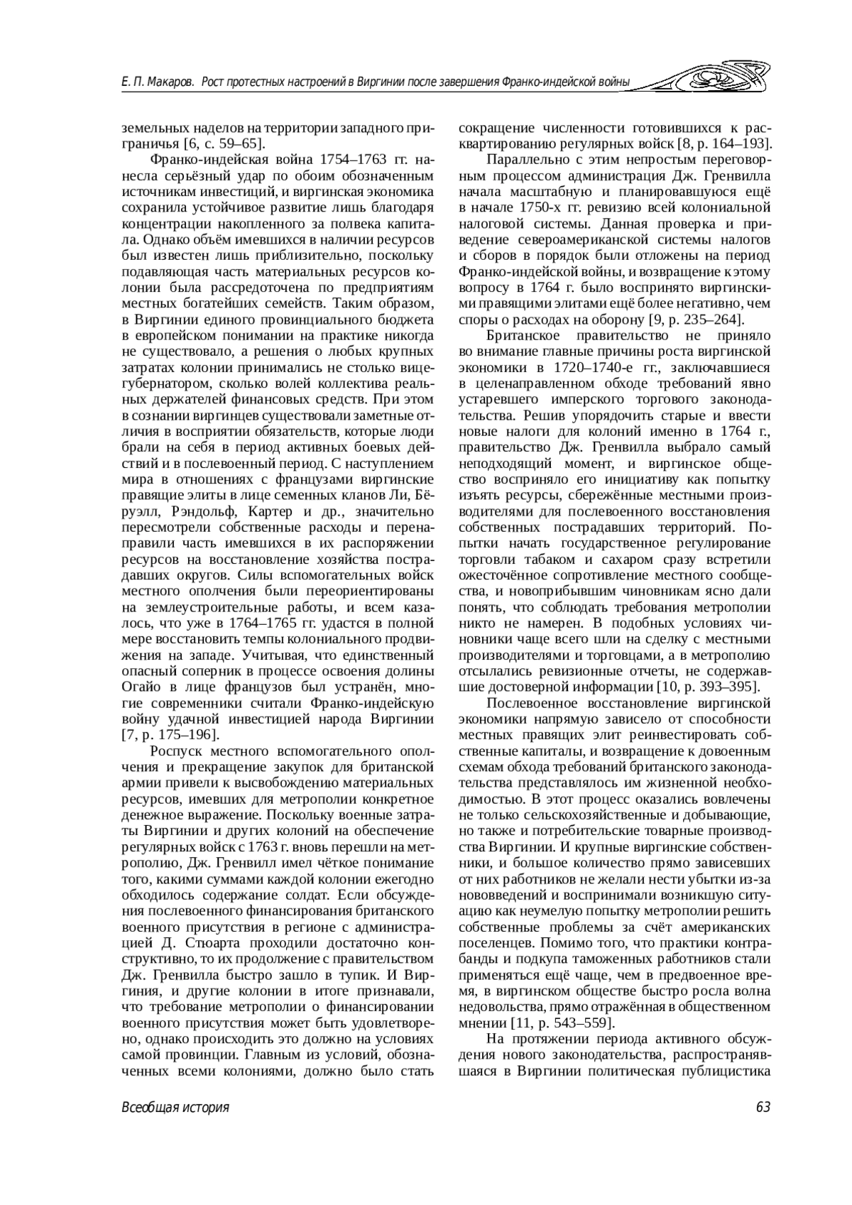 6. Макаров Е. П. Территориальные приобретения виргинских колониальных элит и вооружённые конфликты с коренным населением долины Огайо в середине 1770-х гг. // Известия Самарского научного центра Российской академии наук. Исторические науки. 2021. Т. 3, № 4 (12). С. 59-65. DOI: 10.37313/2658-4816-2021-3-4-59-65 EDN: ZSHCOY