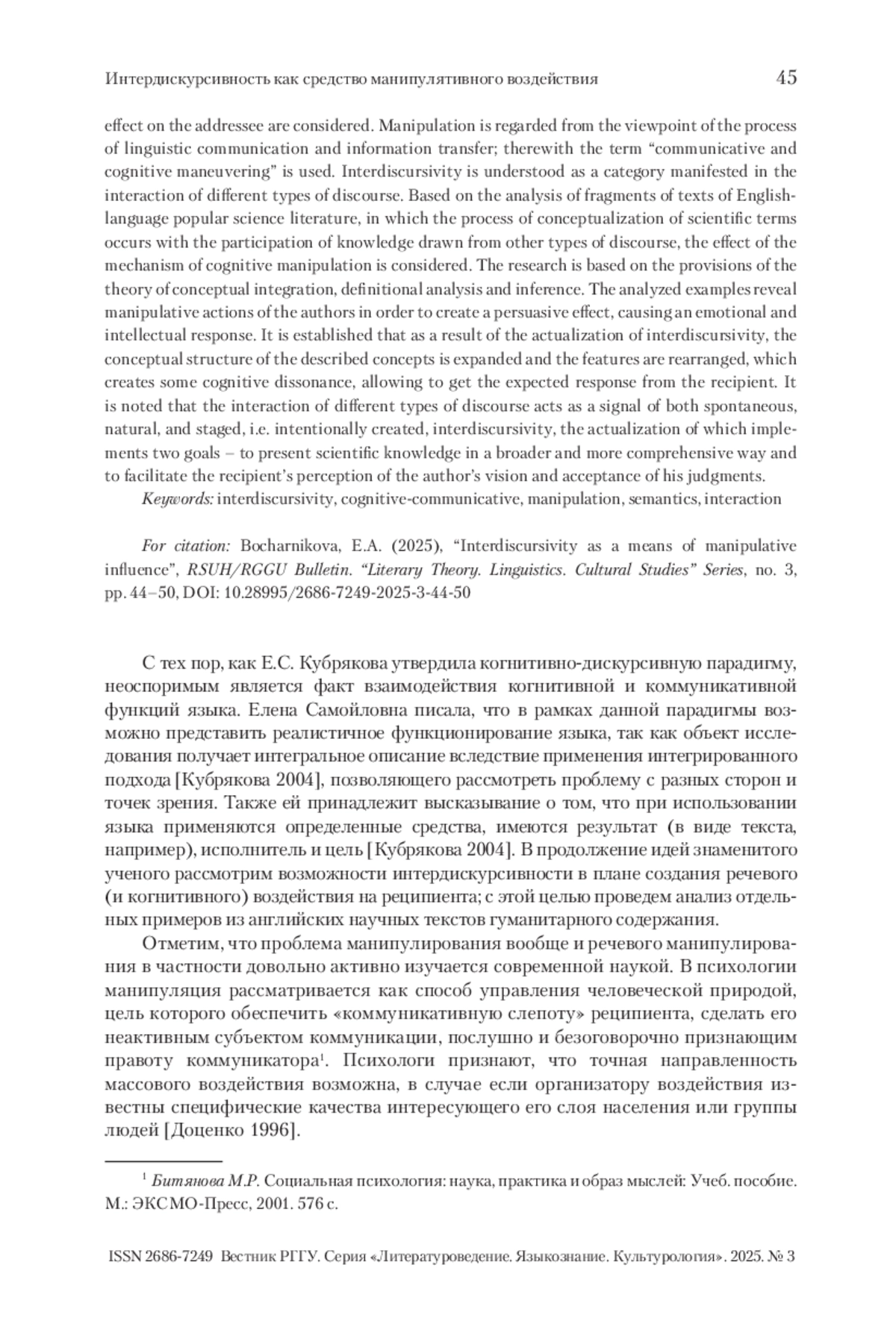В статье дается общее представление о манипулировании и о речевом манипулировании как предмете интереса лингвистов. Рассмотрены возможности интердискурсивности в плане создания манипулятивного воздействия на адресата. Манипуляция рассматривается с точки зрения процесса языковой коммуникации и передачи информации; при этом используется термин «коммуникативно-когнитивное маневрирование». Интердискурсивность понимается как категория, проявляющаяся во взаимодействии разных типов дискурса. На основе анализа фрагментов текстов англоязычной научно-популярной литературы, в которых процесс концептуализации научных понятий происходит с участием привлеченных из других типов дискурса знаний, рассмотрено действие механизма когнитивного манипулирования. В основе исследования лежат положения теории концептуальной интеграции, дефиниционного анализа и инферентного вывода. В проанализированных примерах выявлены манипулятивные действия авторов с целью создания персуазивного эффекта, вызывающие эмоциональный и интеллектуальный отклик. Установлено, что в результате актуализации интердискурсивности происходит расширение концептуальной структуры описываемых понятий и осуществляется перекомпоновка признаков, что создает некоторый когнитивный диссонанс, позволяющий получить ожидаемый отклик от реципиента. Отмечается, что взаимодействие разных типов дискурса выступает сигналом как спонтанной, естественной, так и инсценируемой, т. е. намеренно созданной, интердискурсивности, актуализация которой реализует две цели – представить научное знание более масштабно и комплексно и способствовать восприятию реципиентом авторского видения и принятию его суждений.