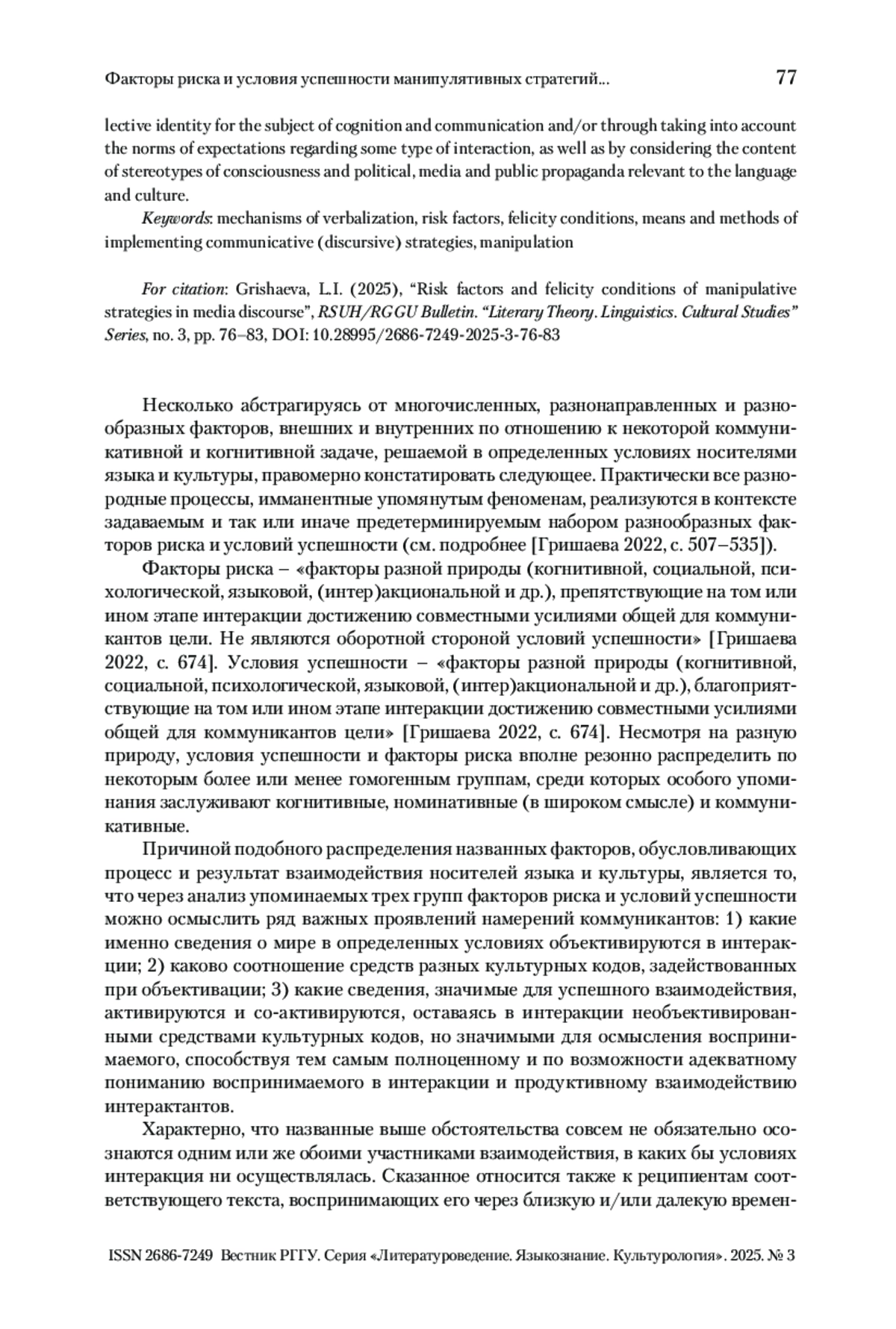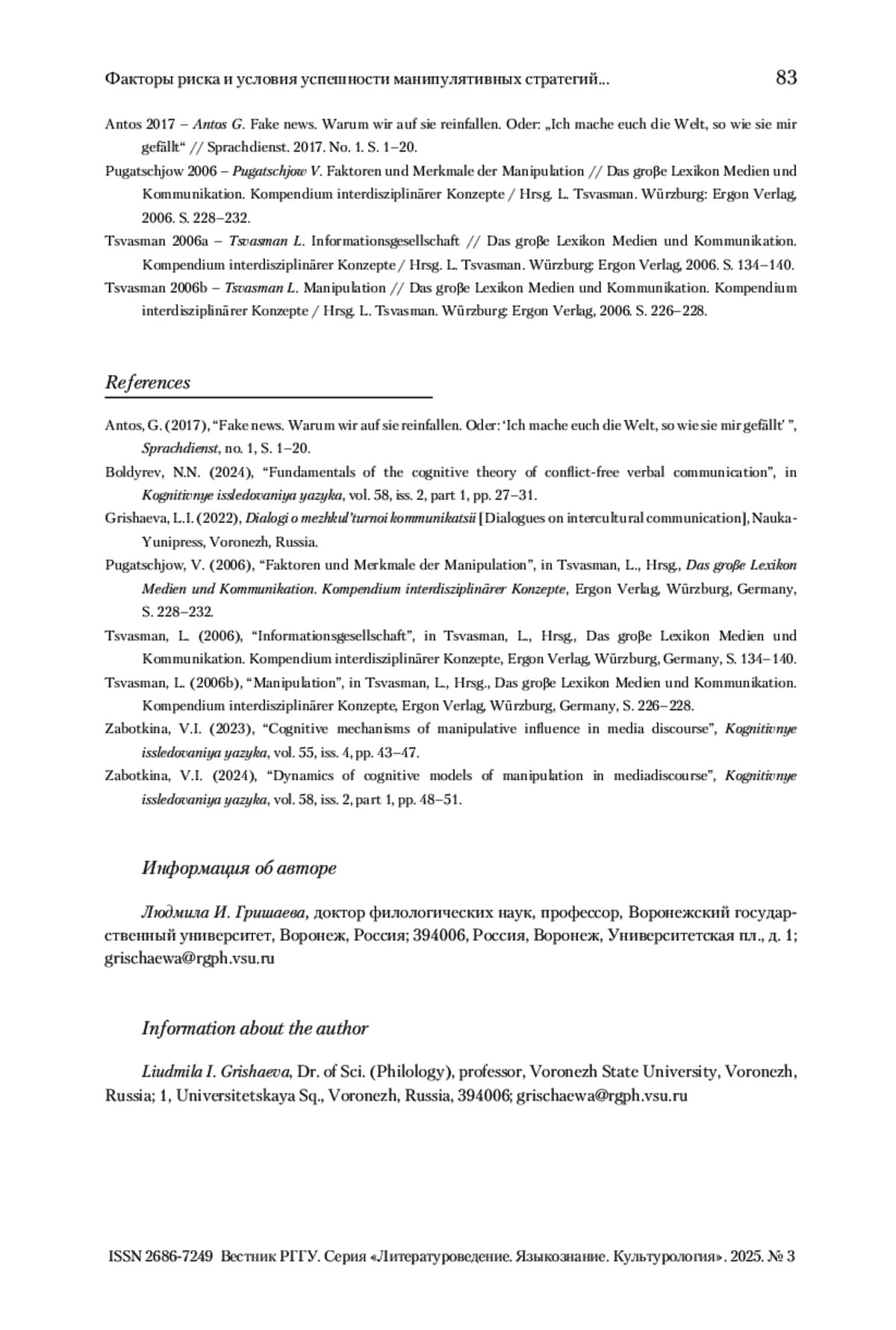 ГРИШАЕВА Л. И. ФАКТОРЫ РИСКА И УСЛОВИЯ УСПЕШНОСТИ МАНИПУЛЯТИВНЫХ СТРАТЕГИЙ В МЕДИАДИСКУРСЕ // ВЕСТНИК РГГУ. СЕРИЯ «ЛИТЕРАТУРОВЕДЕНИЕ. ЯЗЫКОЗНАНИЕ. КУЛЬТУРОЛОГИЯ». 2025. № 3