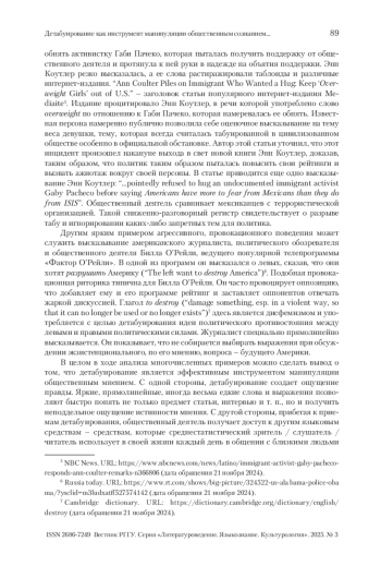 Данное исследование рассматривает дисфемизацию эвфемистических единиц как средство манипулирования общественным сознанием. Целью исследования является выявление факторов, влияющих на изменение коннотации эвфемистических единиц в дискурсе социальных сетей. В ходе исследования выдвинута гипотеза о триггерах (предпосылках) превращения эвфемизма в дисфемизм. Удалось выделить три самых продуктивных дискурсивных механизма формирования семантики амбивалентных эвфемистических единиц, а именно: 1) реализацию метафорических и метонимических концептуальных моделей; 2) нивелирование эвфемистического эффекта путем экспликации или использования синонима; 3) использование языковых единиц, характеризующихся амбивалентной коннотацией наряду с эвфемизмом. В процессе исследования были также описаны пять концептуальных моделей формирования фонда дисфемистических единиц в дискурсе социальных сетей. Сделан вывод о роли дисфемизации в процессе манипуляции общественным сознанием. На основе полученных результатов можно рассматривать дисфемизацию эвфемистических единиц как эффективный инструмент воздействия на общественное сознание и формирования определенного мнения о событиях или явлениях. Данное исследование позволяет более глубоко понять процессы манипуляции языком и выявить механизмы, с помощью которых происходит изменение коннотации слов и выражений в дискурсе социальных сетей.
