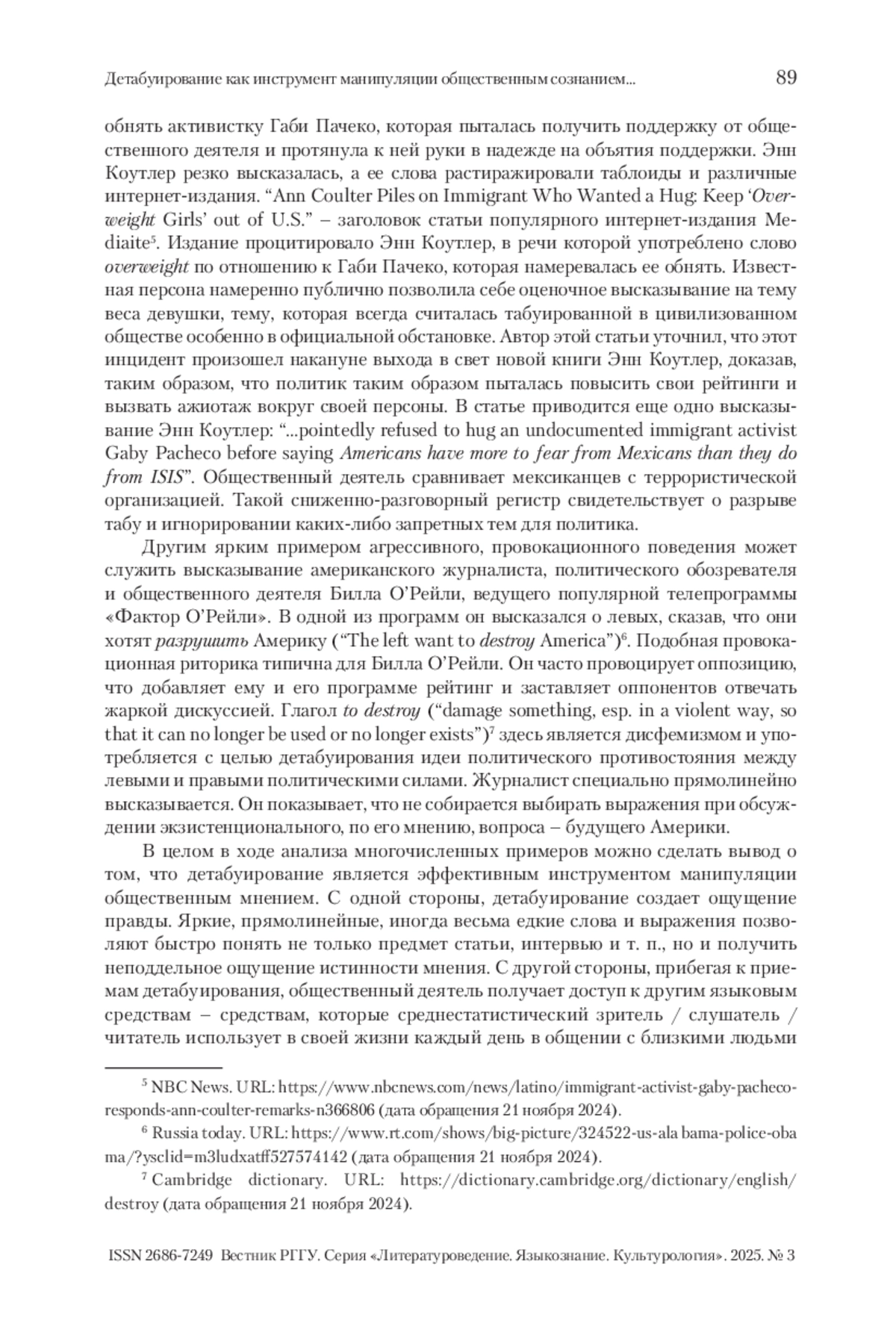 В статье рассматриваются примеры языкового детабуирования, применяемого в современных англоязычных массмедиа в целях манипуляции общественным сознанием. Раскрывается понятие табуирования, которое находит свое отражение в современных СМИ и применяется, когда на пресс-конференциях, ток-шоу или в интервью затрагиваются темы, которые традиционно подвергаются табуированию в общественной жизни – смерть, межличностные отношения, болезни, психические и физические недостатки, нарушение прав, насилие, война, критика традиций и устоев других стран и национальностей и др. Рассматриваются языковые средства детабуирования – дисфемизмы и средства вербализации концепта FRIEND-AND-FOE/СВОЙ–ЧУЖОЙ. Согласно анализу языкового материала, для оппозиции «свой-чужой» характерно использование детабуирования относительно «чужих», а табуирования – относительно «своих». Плохие поступки «чужих» именуются прямолинейно и экспрессивно часто с помощью дисфемизмов, в то время как аналогичные поступки «своих» освещаются в нейтральных выражениях с применением эвфемизмов. Основная цель детабуирования заключается в разрыве табу и преодолении каких-либо запретов. Анализируются причины обращения к детабуированию, среди которых дискредитация противника, нежелание смягчать неприятные реалии жизни, агрессивное поведение, желание сблизиться с аудиторией и др.