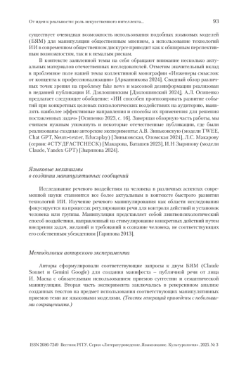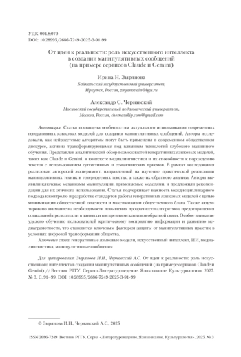 Статья посвящена особенностям актуального использования современных генеративных языковых моделей для создания манипулятивных сообщений. Авторы исследовали, как нейросетевые алгоритмы могут быть применены в современном общественном дискурсе, активно трансформирующемся под влиянием технологий глубокого машинного обучения. Представлен аналитический обзор возможностей генеративных языковых моделей, таких как Claude и Gemini, в контексте медиалингвистики и их способности к порождению текстов с использованием суггестивных и семантических приемов. В рамках исследования реализован авторский эксперимент, направленный на изучение практической реализации манипулятивных техник в генерируемых текстах, а также их обратного анализа. Авторы выявили ключевые механизмы манипуляции, применяемые моделями, и предложили рекомендации для их этичного использования. Статья подчеркивает важность междисциплинарного подхода к контролю и разработке стандартов работы генеративных языковых моделей с целью минимизации общественной опасности и максимизации общественного блага. Также акцентировано внимание на необходимости повышения прозрачности алгоритмов, предотвращения социальной предвзятости в данных и внедрения механизмов обратной связи. Особое внимание уделено обучению пользователей критическому восприятию информации и развитию медиаграмотности, что становится ключевым фактором защиты от манипулятивных практик в условиях цифровой трансформации общества.