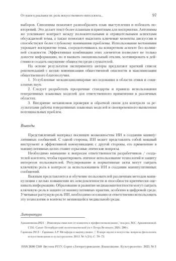 4. Зиньковская, Оломская 2024 - Зиньковская А.В., Оломская Н.Н. Манипуляция человеческим сознанием посредством искусственного интеллекта как гуманитарная проблема XXI века // Российский социально-гуманитарный журнал. 2024. № 1. С. 258-276. URL: https://www.evestnik-mgou.ru/jour/article/view/1386 (дата обращения 17 ноября 2024).
