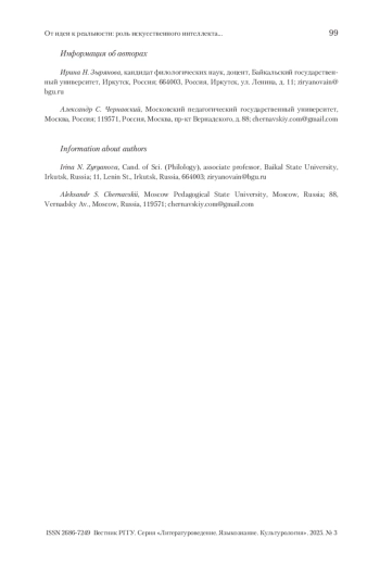 6. Зырянова 2024 - Зырянова И.Н., Чернавский А.С. Потенциал применения генеративных языковых моделей в современной медиакоммуникации и журналистике (на примере Claude и Yalm 2.0) // Знак: проблемное поле медиаобразования. 2024. № 3 (53). С. 108-121.