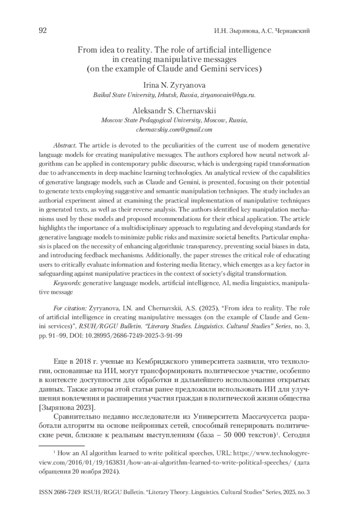 5. Зырянова 2023 - Зырянова И.Н., Чернавский А.С. Лингвопсихологический анализ возможностей современных генеративных языковых моделей в политических дискурсивных практиках (на примере Chat GPT) // Знак: проблемное поле медиаобразования. 2023. № 4 (50) С. 29-39.