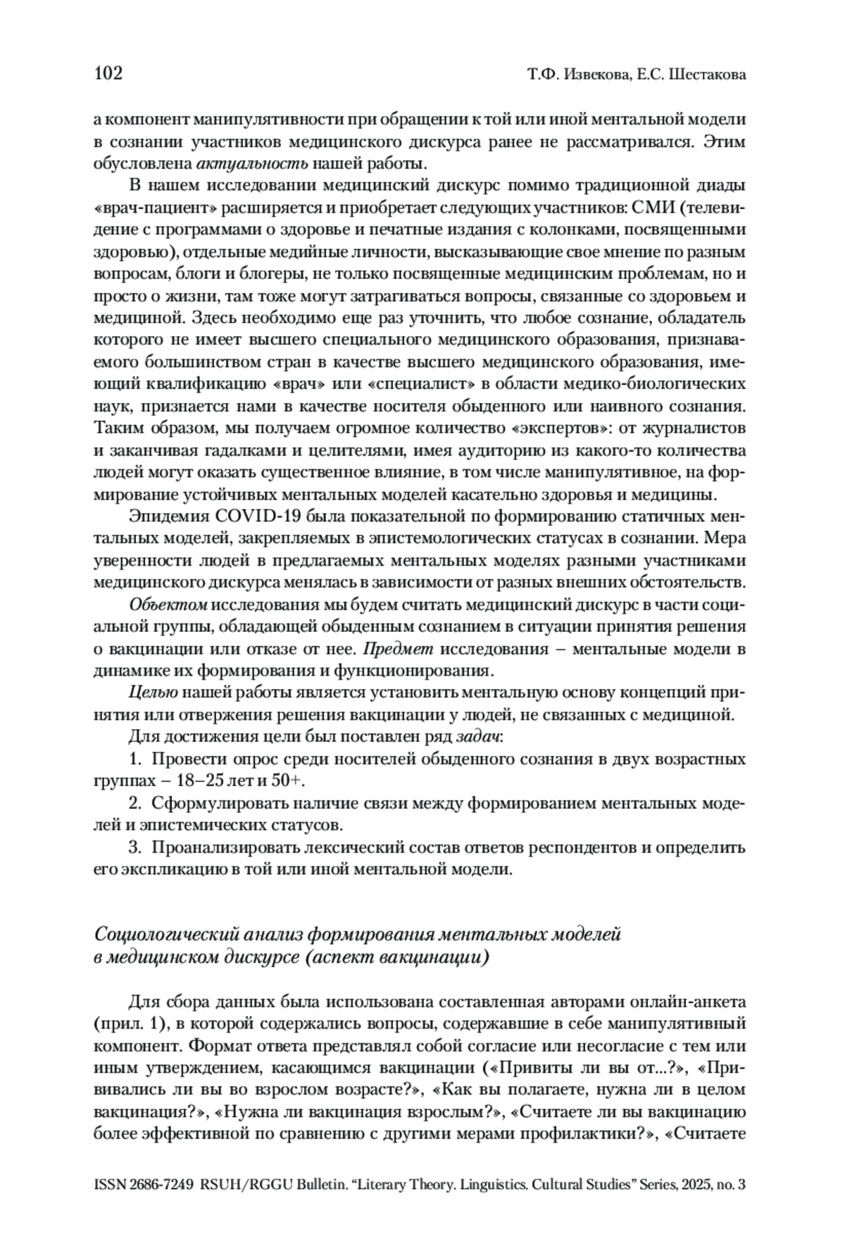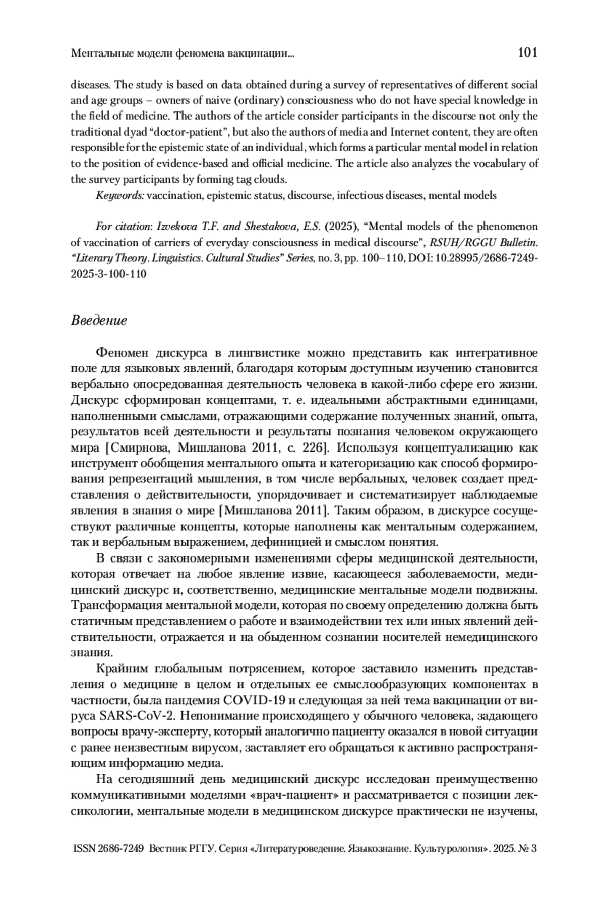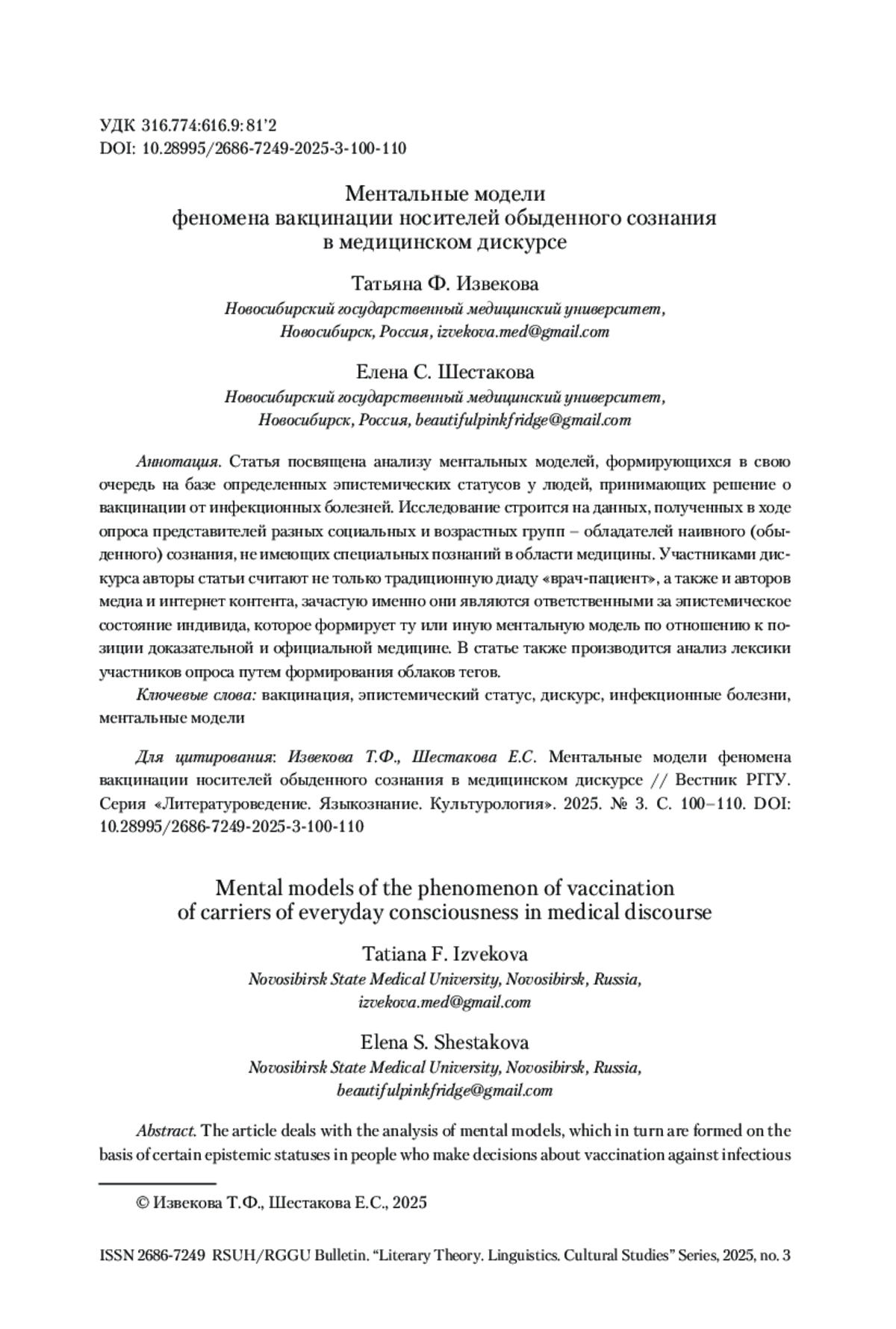 ИЗВЕКОВА Т. Ф., ШЕСТАКОВА Е. С. МЕНТАЛЬНЫЕ МОДЕЛИ ФЕНОМЕНА ВАКЦИНАЦИИ НОСИТЕЛЕЙ ОБЫДЕННОГО СОЗНАНИЯ В МЕДИЦИНСКОМ ДИСКУРСЕ // ВЕСТНИК РГГУ. СЕРИЯ «ЛИТЕРАТУРОВЕДЕНИЕ. ЯЗЫКОЗНАНИЕ. КУЛЬТУРОЛОГИЯ». 2025. № 3