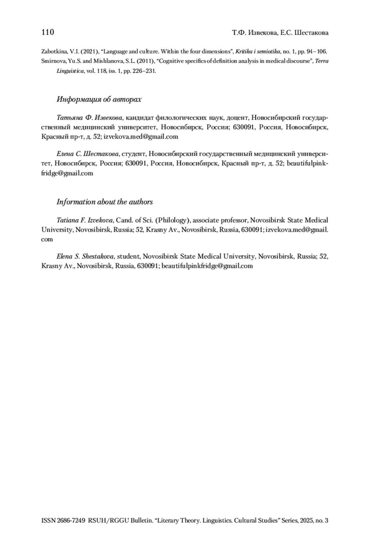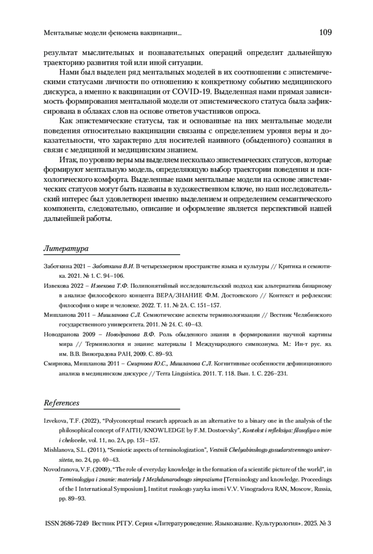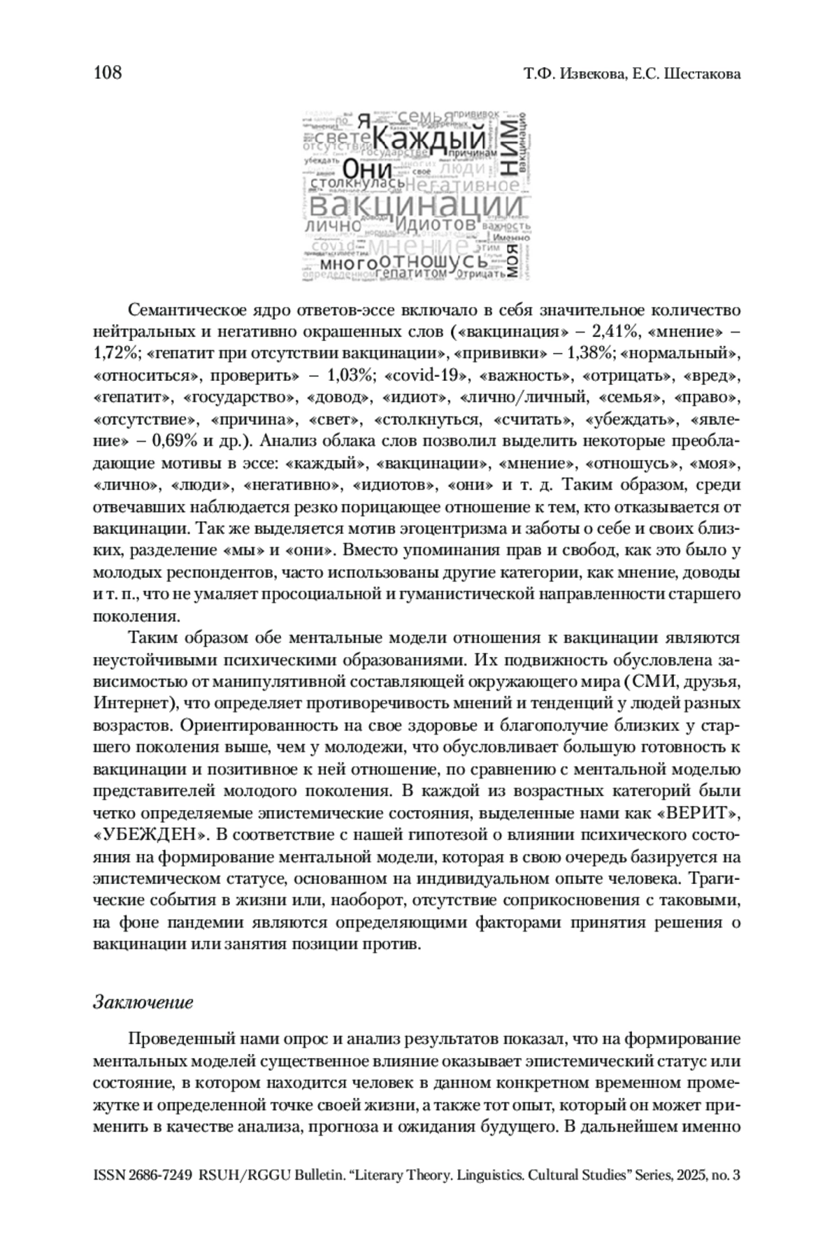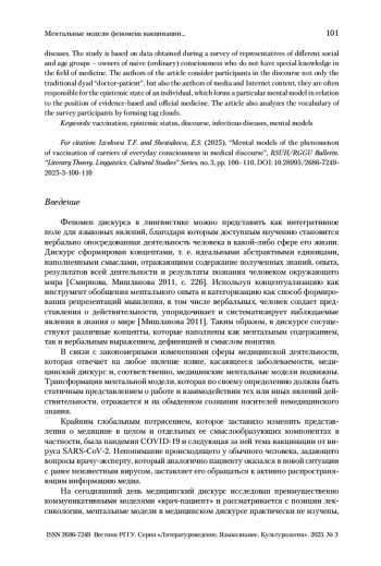 ИЗВЕКОВА Т. Ф., ШЕСТАКОВА Е. С. МЕНТАЛЬНЫЕ МОДЕЛИ ФЕНОМЕНА ВАКЦИНАЦИИ НОСИТЕЛЕЙ ОБЫДЕННОГО СОЗНАНИЯ В МЕДИЦИНСКОМ ДИСКУРСЕ // ВЕСТНИК РГГУ. СЕРИЯ «ЛИТЕРАТУРОВЕДЕНИЕ. ЯЗЫКОЗНАНИЕ. КУЛЬТУРОЛОГИЯ». 2025. № 3
