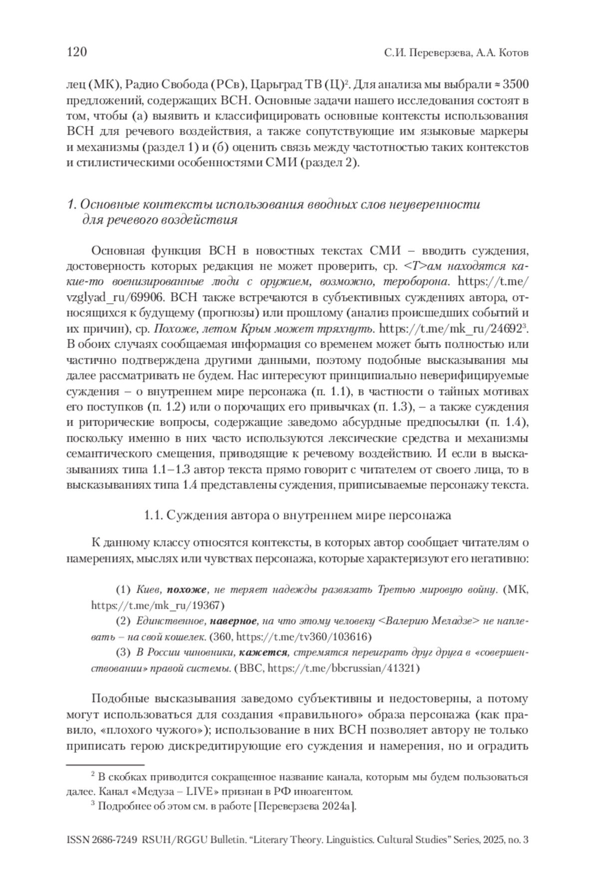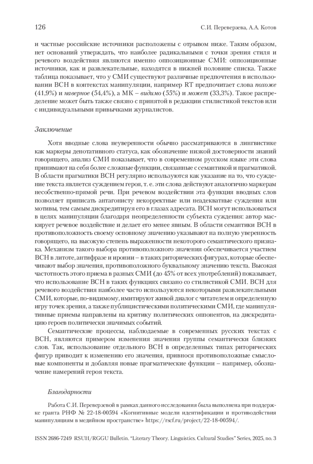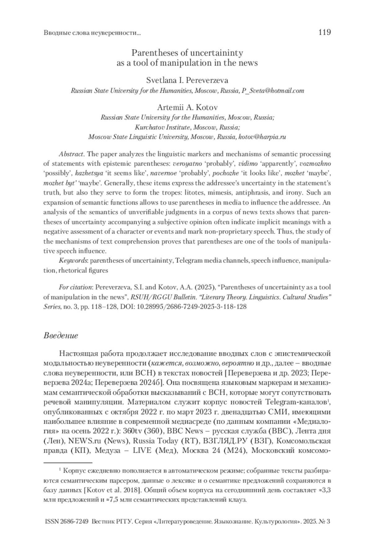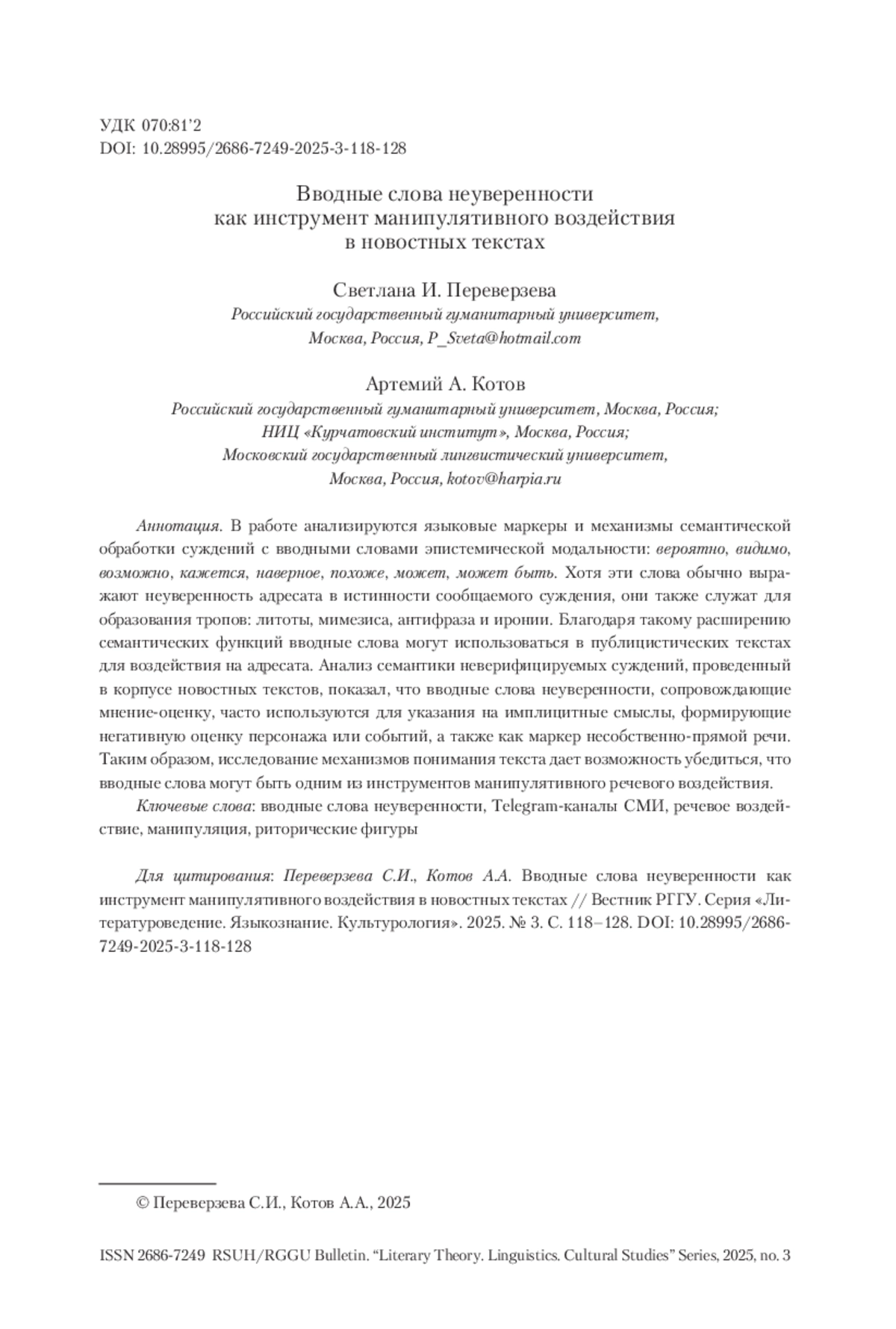 ПЕРЕВЕРЗЕВА С. И., КОТОВ А. А. ВВОДНЫЕ СЛОВА НЕУВЕРЕННОСТИ КАК ИНСТРУМЕНТ МАНИПУЛЯТИВНОГО ВОЗДЕЙСТВИЯ В НОВОСТНЫХ ТЕКСТАХ // ВЕСТНИК РГГУ. СЕРИЯ «ЛИТЕРАТУРОВЕДЕНИЕ. ЯЗЫКОЗНАНИЕ. КУЛЬТУРОЛОГИЯ». 2025. № 3