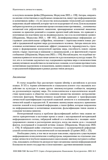 МАНЕРКО Л. А. ИДЕНТИЧНОСТЬ ЛИЧНОСТИ И НАЦИИ КАК ОБЪЕКТ МАНИПУЛЯТИВНОГО ВОЗДЕЙСТВИЯ В УСЛОВИЯХ ГИБРИДНОЙ ВОЙНЫ // ВЕСТНИК РГГУ. СЕРИЯ «ЛИТЕРАТУРОВЕДЕНИЕ. ЯЗЫКОЗНАНИЕ. КУЛЬТУРОЛОГИЯ». 2025. № 3