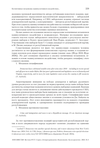 В статье рассматривается манипулятивное воздействие на сознание человека в медиадискурсе на примере либерального новостного издания. Выявление когнитивных механизмов, активизируемых в этой области, позволило раскрыть комплексную природу манипулятивного воздействия. Установлены механизмы спецификации, противопоставления, градуирования, концептуальной метонимии, метафоры и метафтонимии, а также случаи взаимодействия механизмов градуирования и концептуальной метафоры, перспективизации и градуирования. В качестве установки манипулятивного воздействия отмечено такое понятие, как предвзятость по отношению к представителям другой группы, что приводит к появлению у них когнитивного диссонанса. Однопартийцы же оцениваются всегда позитивно. Сделан вывод о том, что манипуляция как контроль и управление сознанием человека реализуется косвенно и может быть разъяснена за счет задействованных в этих процессах когнитивных механизмов. Установлено также, что предвзятость интерпретируется как поляризация оценочного знания в виде одобрительной модальности в отношении представителей своей группы и негативной – в отношении членов другой группы. Перспектива данного исследования заключается в возможности применения полученных результатов в анализе манипулятивного воздействия в других типах дискурса и на материале других языков.