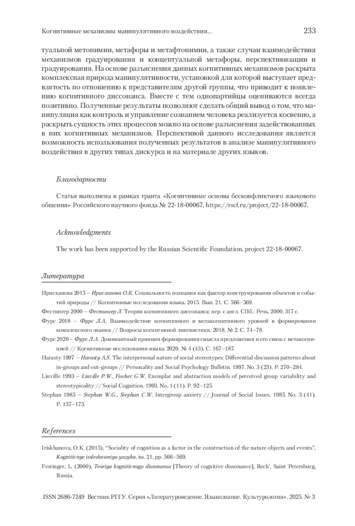 В статье представлено новое междисциплинарное проблемное поле гуманитарного знания, а именно поле манипулятивного воздействия в медиадискурсе. Акцент делается на необходимости создания интегрированного знания в данном проблемном поле. Предлагается динамическая многоуровневая когнитивная мегамодель манипуляции, которая представлена на трех уровнях когнитивной динамики. Привлекаются данные из психологии, нейронаук, искусственного интеллекта, теории подталкивания. В основе многоуровневой мегамодели лежит универсальная когнитивная операция концептуального проецирования между различными доменами знания и структурирующими их фреймами, вовлеченными в процесс манипуляции. Мы ставим вопрос о том, каков характер когнитивной обработки информации в данном процессе. Мы приходим к заключению о необходимости анализа взаимодействия между типом концептуального проецирования и типом когнитивных сбоев, возникающих в результате манипуляции. Особое внимание в статье уделяется вопросу вовлечения в процесс манипуляции искусственного интеллекта и, в частности, больших языковых моделей (LLM) – GPT-4. Предлагается также изучить роль искусственного интеллекта как манипулятора и как идентификатора манипуляции в медиадискурсе.
