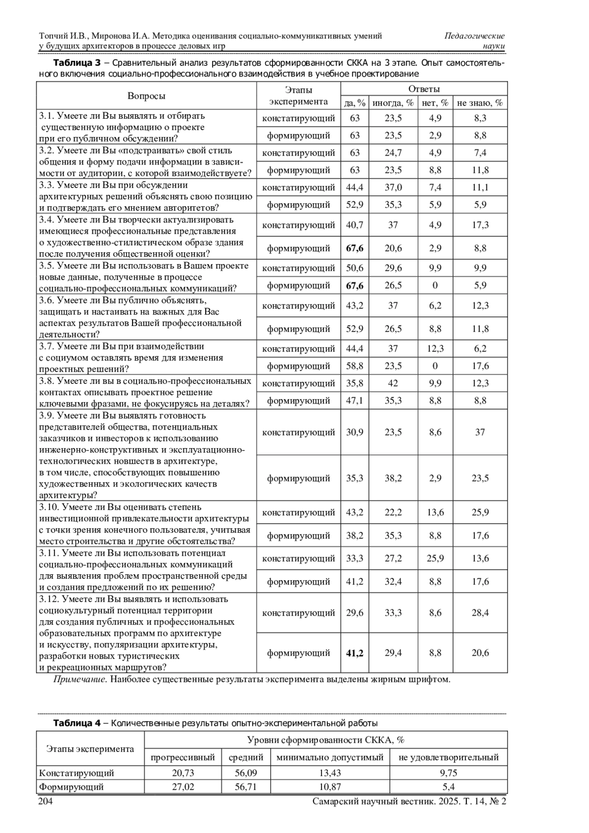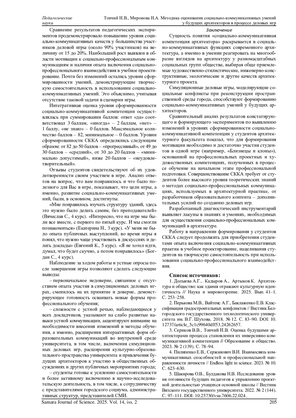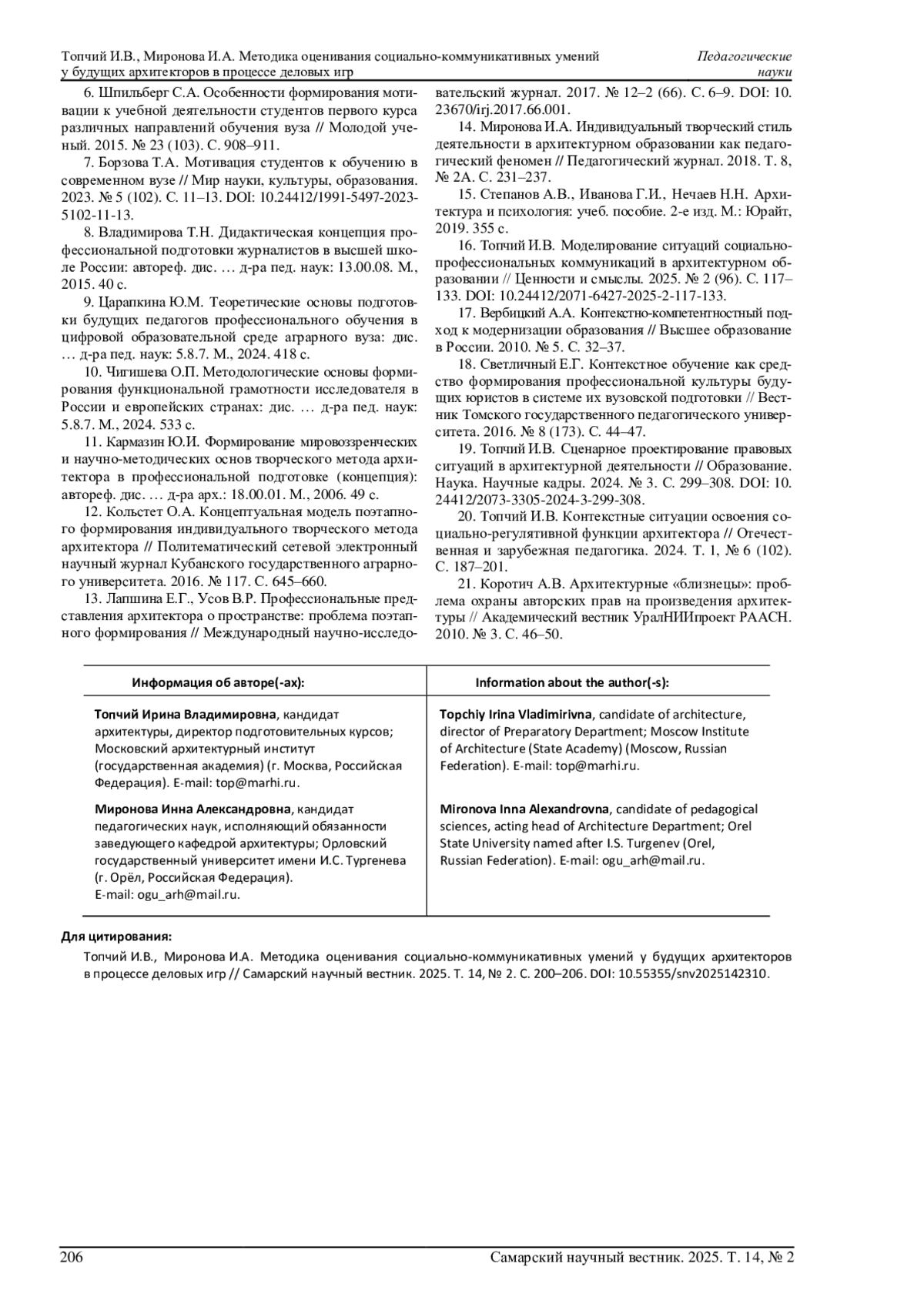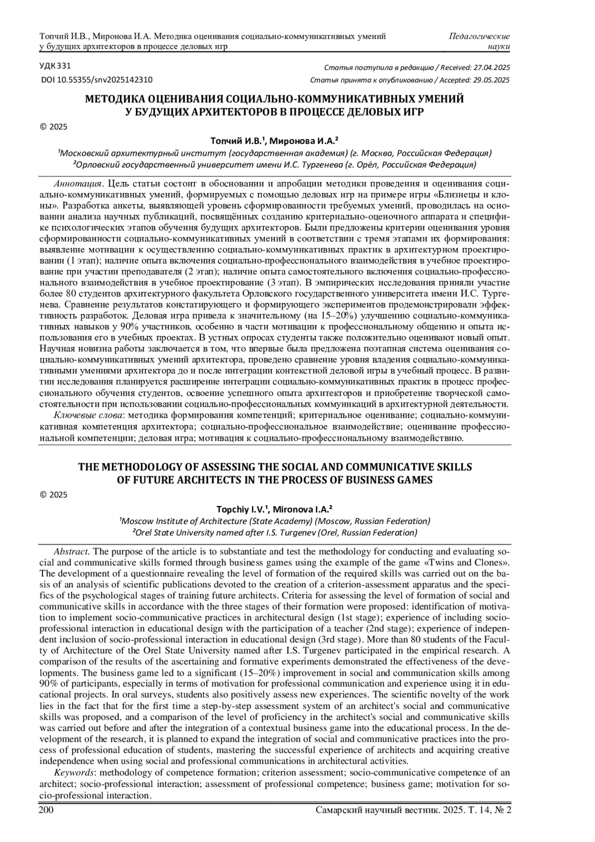 ТОПЧИЙ И. В., МИРОНОВА И. А. МЕТОДИКА ОЦЕНИВАНИЯ СОЦИАЛЬНО-КОММУНИКАТИВНЫХ УМЕНИЙ У БУДУЩИХ АРХИТЕКТОРОВ В ПРОЦЕССЕ ДЕЛОВЫХ ИГР // САМАРСКИЙ НАУЧНЫЙ ВЕСТНИК. 2025. ТОМ 14, № 2