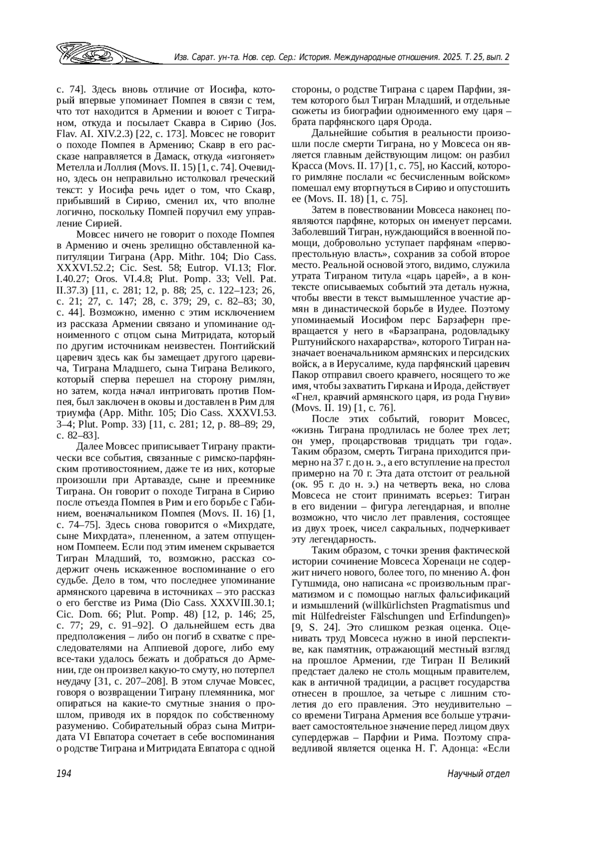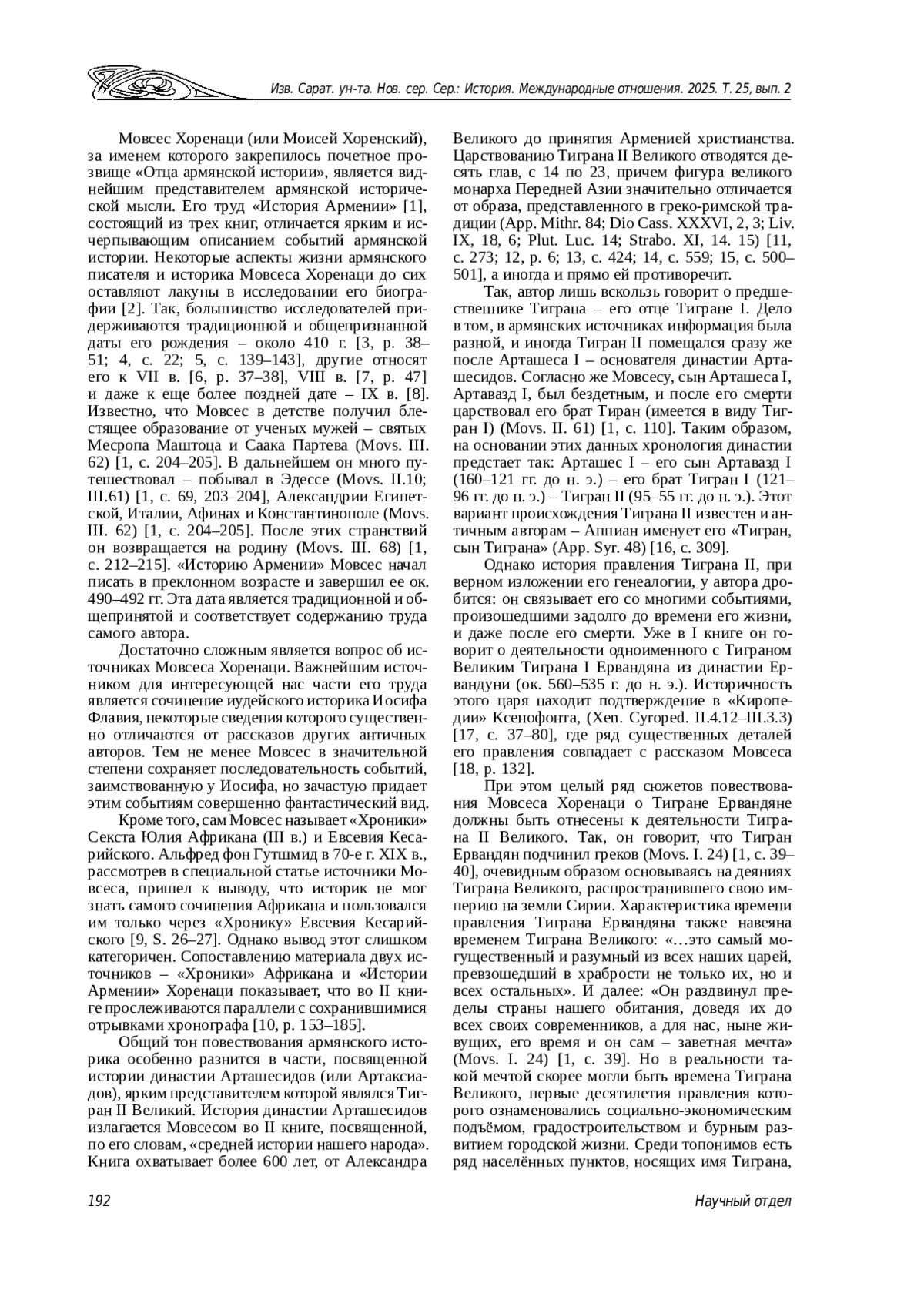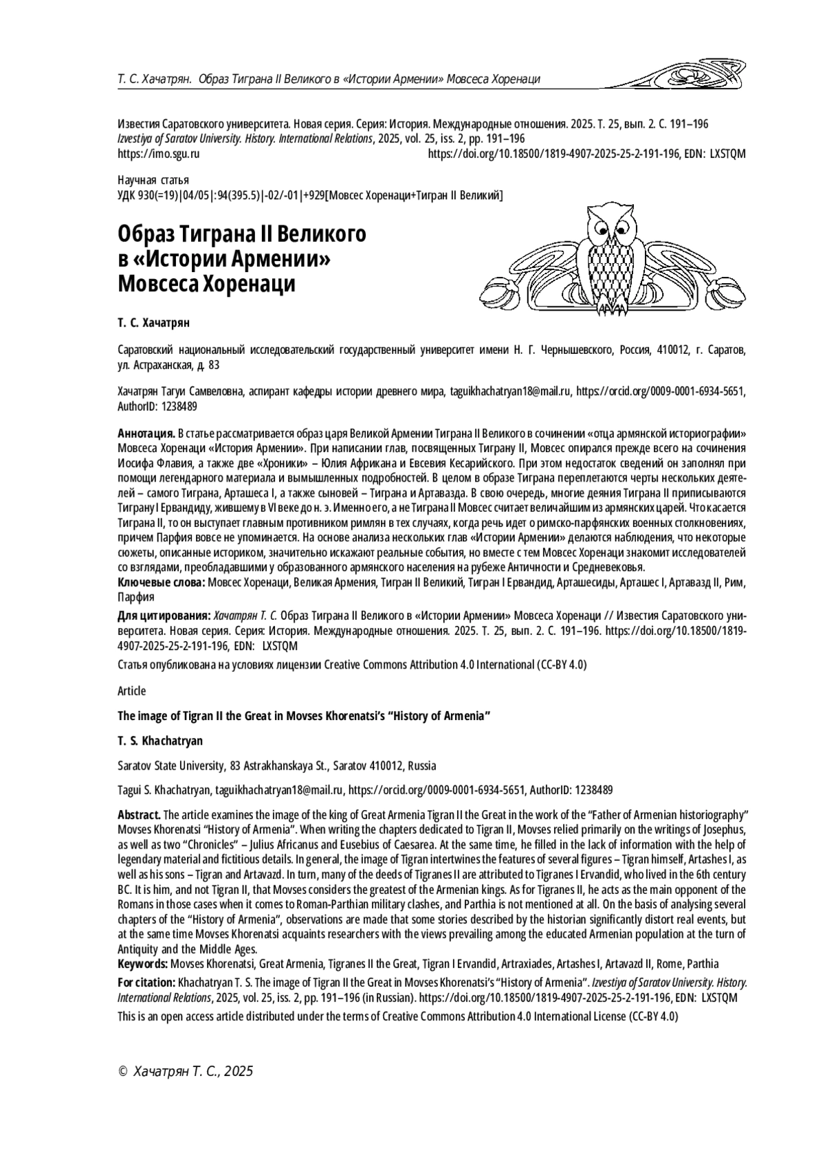 ХАЧАТРЯН Т. С. ОБРАЗ ТИГРАНА II ВЕЛИКОГО В «ИСТОРИИ АРМЕНИИ» МОВСЕСА ХОРЕНАЦИ // ИЗВЕСТИЯ САРАТОВСКОГО УНИВЕРСИТЕТА. НОВАЯ СЕРИЯ. СЕРИЯ: ИСТОРИЯ. МЕЖДУНАРОДНЫЕ ОТНОШЕНИЯ. 2025. Т. 25 № 2