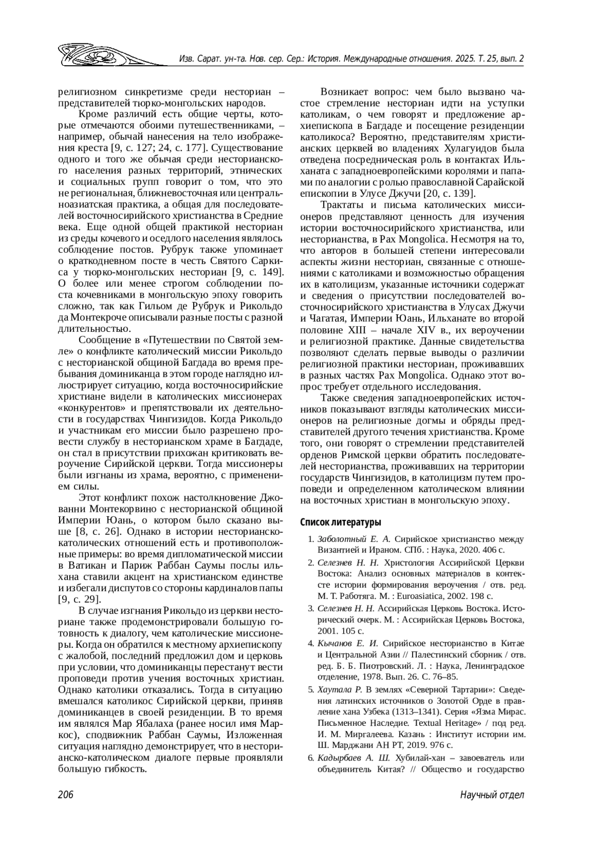 КОСТОГРЫЗОВА С. Е. СВЕДЕНИЯ ЗАПАДНОЕВРОПЕЙСКИХ ИСТОЧНИКОВ О НЕСТОРИАНАХ ГОСУДАРСТВ ЧИНГИЗИДОВ ВО ВТОРОЙ ПОЛОВИНЕ XIII - НАЧАЛЕ XIV ВЕКА // ИЗВЕСТИЯ САРАТОВСКОГО УНИВЕРСИТЕТА. НОВАЯ СЕРИЯ. СЕРИЯ: ИСТОРИЯ. МЕЖДУНАРОДНЫЕ ОТНОШЕНИЯ. 2025. Т. 25 № 2