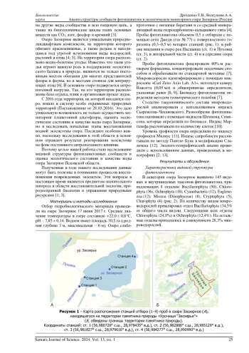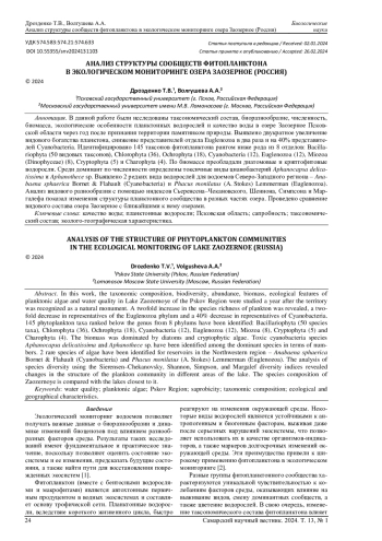 В данной работе были исследованы таксономический состав, биоразнообразие, численность, биомасса, экологические особенности планктонных водорослей и качество воды в озере Заозерное Псковской области через год после признания территории памятником природы. Выявлено двукратное увеличение видового богатства планктона, снижение представителей отдела Euglenozoa в два раза и на 40% представителей Cyanobacteria. Идентифицировано 145 таксонов фитопланктона рангом ниже рода из 8 отделов: Bacillariophyta (50 видовых таксонов), Chlorophyta (36), Ochrophyta (18), Cyanobacteria (12), Euglenozoa (12), Miozoa (Dinophyceae) (8), Cryptophyta (5) и Charophyta (4). По биомассе преобладали диатомовые и криптофитовые водоросли. Среди доминант по численности определены токсичные виды цианобактерий Aphanocapsa delicatissima и Aphanothece sp. Выявлено 2 редких вида водорослей для водоемов Северо-Западного региона - Anabaena sphaerica Bornet & Flahault (Cyanobacteria) и Phacus monilatus (A. Stokes) Lemmerman (Euglenozoa). Анализ видового разнообразия с помощью индексов Сьеренсена-Чекановского, Шеннона, Симпсона и Маргалефа показал изменения структуры планктонного сообщества в разных частях озера. Проведено сравнение видового состава озера Заозерное с ближайшими к нему озерами.