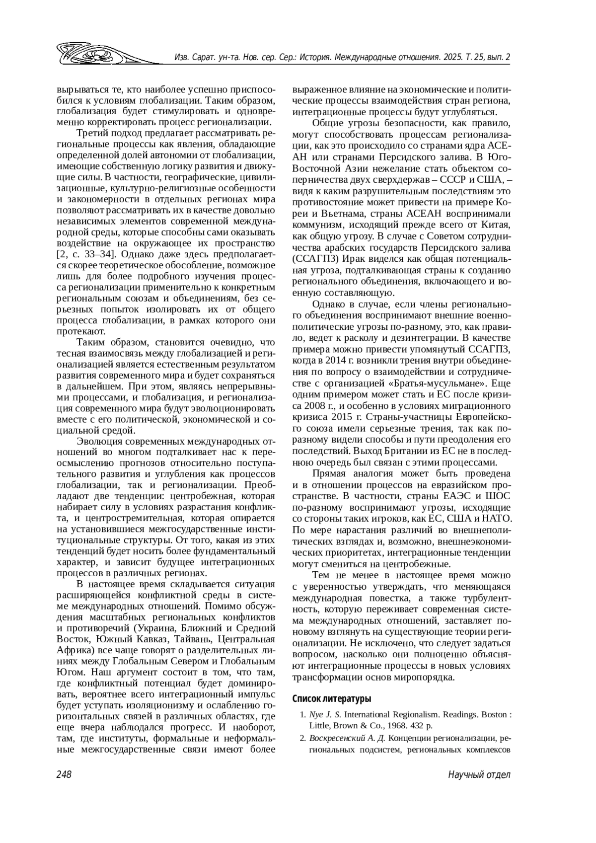 2. Воскресенский А. Д. Концепции регионализации, региональных подсистем, региональных комплексов и региональных трансформаций в современных международных отношениях // Сравнительная политика. 2012. № 2 (8). C. 30-58. EDN: QCMENH