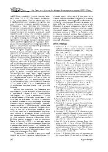 8. Смирнова Е. М., Ерегина Н. Т. “Карантины чуть не взбунтовали 16 губерний”: власть, врачи и общественность России в борьбе с эпидемиями холеры (XIX - начало XX веков) // Новый исторический вестник. 2021. № 2 (68). С. 33-48. EDN: SVZJDB