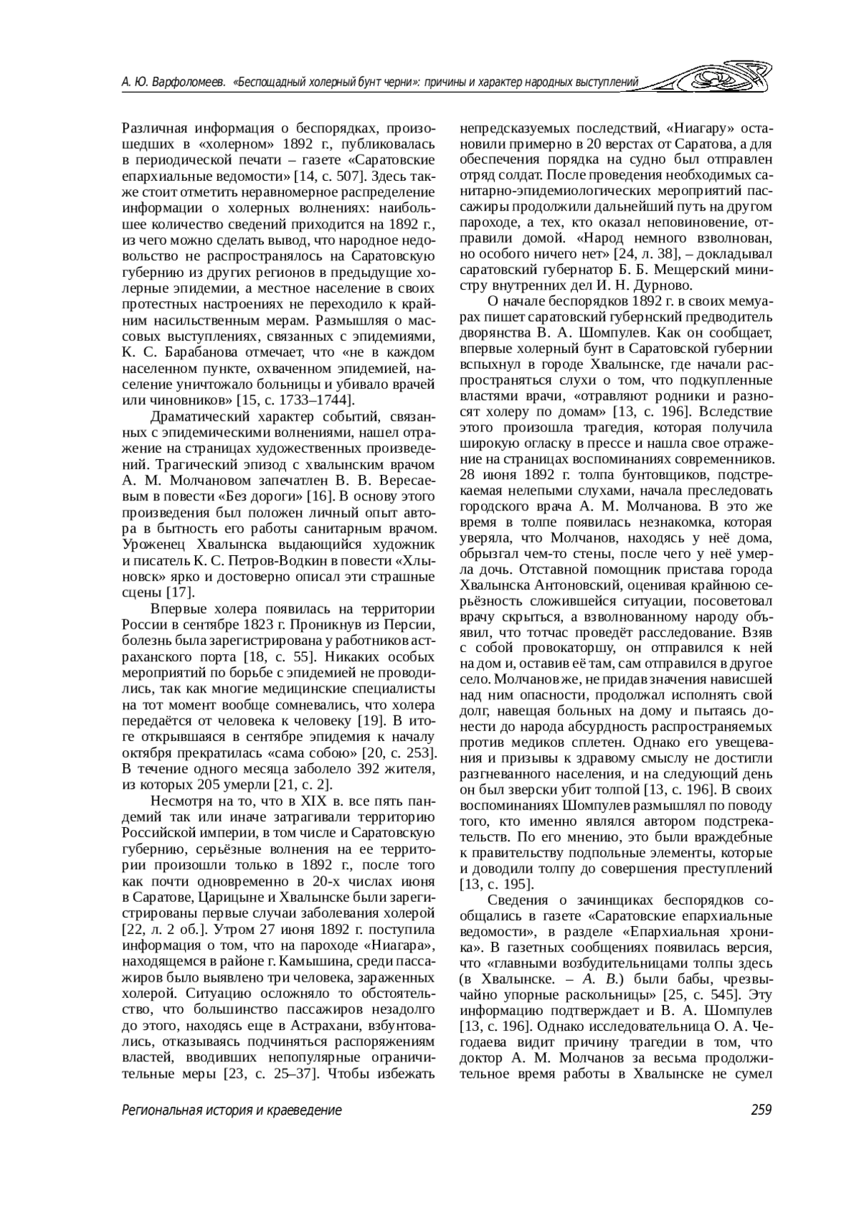 23. Варфоломеев А. Ю. Деятельность губернских и местных властей по борьбе с эпидемией холеры в Саратовском Поволжье в 1892 г. // Известия высших учебных заведений. Поволжский регион. Гуманитарные науки. 2023. № 4. С. 25-37. DOI: 10.21685/2072-3024-2023-4-3 EDN: EJUIOU