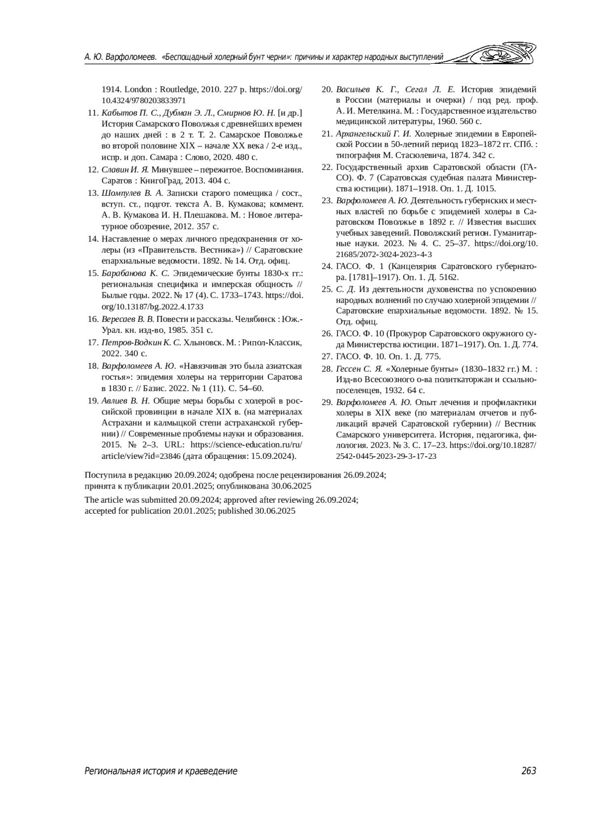 29. Варфоломеев А. Ю. Опыт лечения и профилактики холеры в XIX веке (по материалам отчетов и публикаций врачей Саратовской губернии) // Вестник Самарского университета. История, педагогика, филология. 2023. № 3. С. 17-23. DOI: 10.18287/2542-0445-2023-29-3-17-23 EDN: UKZOFM