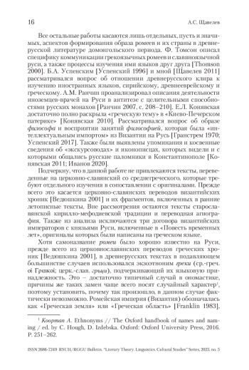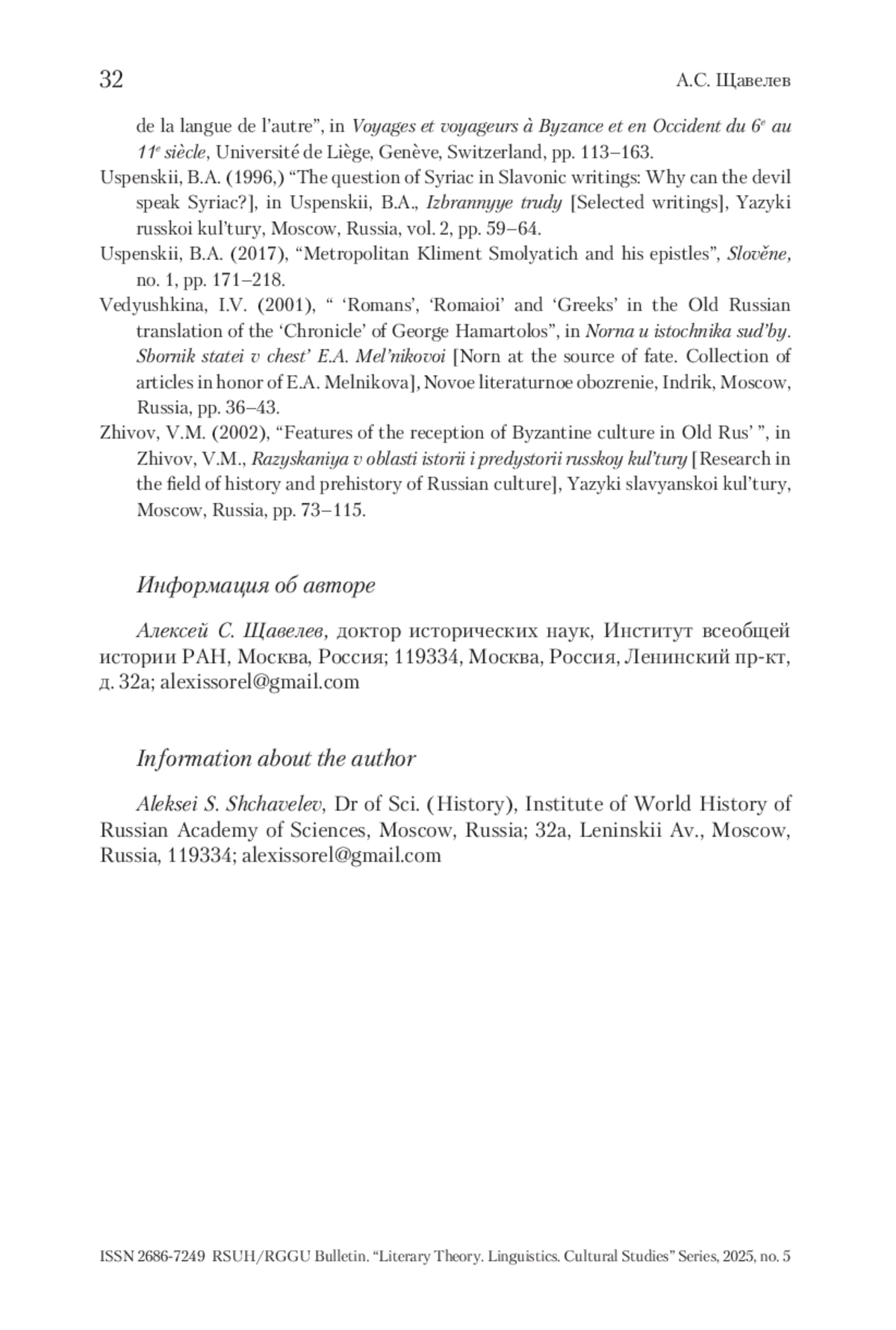 2. Ведюшкина 2001 - Ведюшкина И.В. «Римляне», «Ромеи» и «Греки» в древнерусском переводе «Хроники» Георгия Амартола // Норна у источника судьбы: Сб. статей в честь Е.А. Мельниковой. М.: Индрик, 2001. С. 36-43.