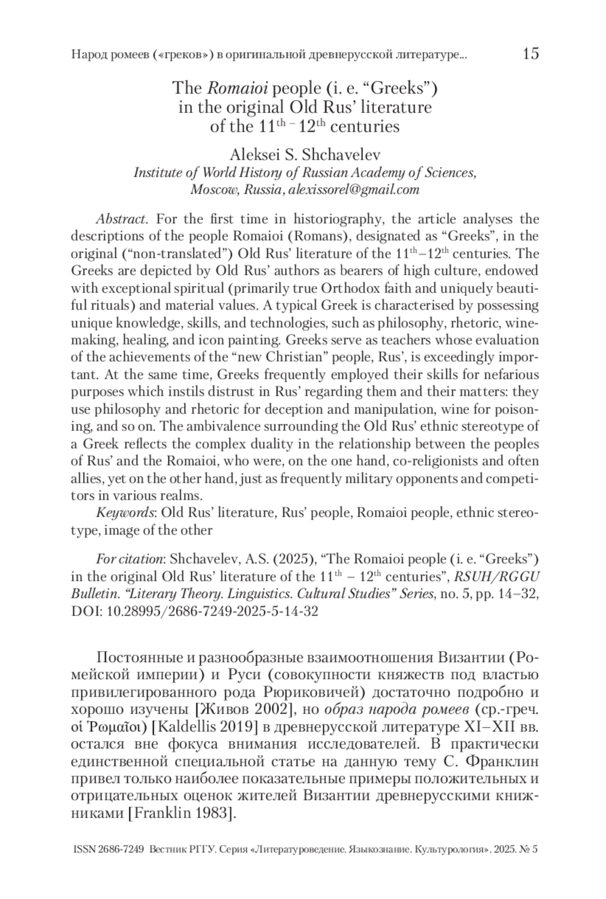 В статье практически впервые в историографии анализируются известия о народе ромеев, обозначаемых как «греки», в оригинальной («непереводной») древнерусской литературе XI–XII вв. Народ греков представлен у древнерусских авторов как носитель высокой культуры, владеющий исключительными духовными (прежде всего истинная православная вера и неповторимая по красоте обрядность) и материальными ценностями. Типичный грек описывается как обладатель уникальных знаний, умений и технологий (философии, риторики, виноделия, лечения, иконописи и др.). Греки выступают как учителя «нового христианского» народа русь. Одновременно греки отличаются тем, что зачастую используют свои навыки во зло: философию и риторику – для обмана и манипулирования, вино – для отравления и т. д. Это провоцирует у руси недоверие к ним и их технологиям. Амбивалентность древнерусского этнического стереотипа грека отражает двойственность взаимоотношений руси и ромеев, которые, с одной стороны, являлись единоверцами и часто оказывались союзниками, а с другой – не менее часто были военными противниками и конкурентами в разных областях.