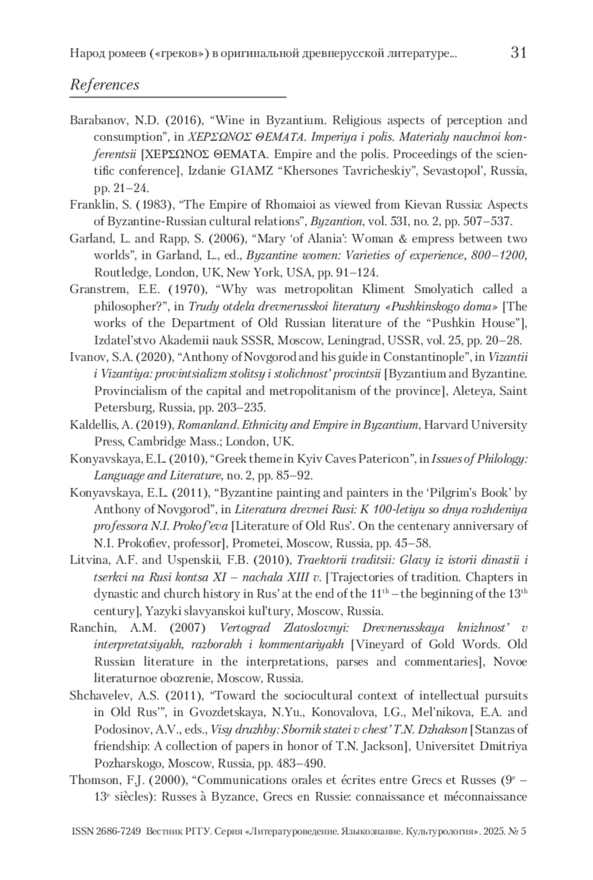 13. Franklin 1983 - Franklin S. The Empire of Rhomaioi as viewed from Kievan Russia: Aspects of Byzantine-Russian cultural relations // Byzantion. 1983. Vol. 53. No. 2. P. 507-537.