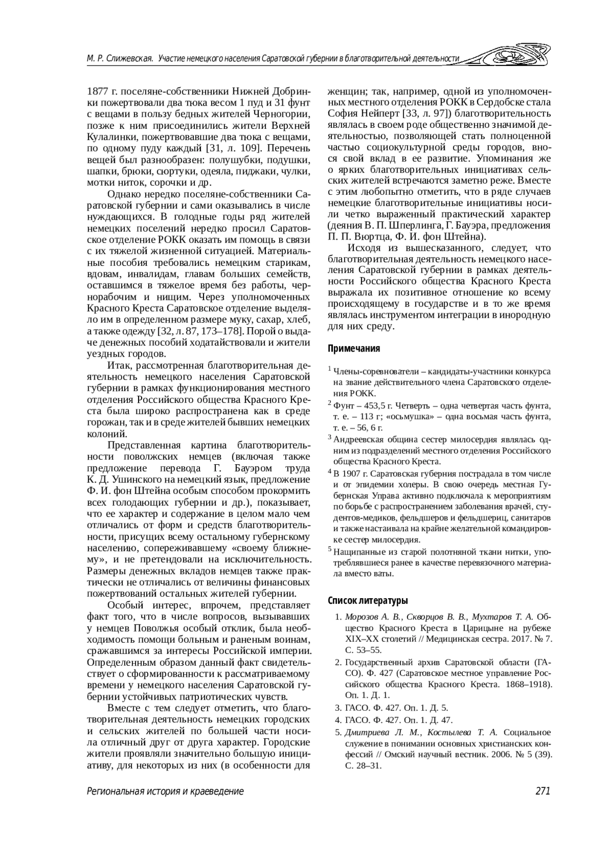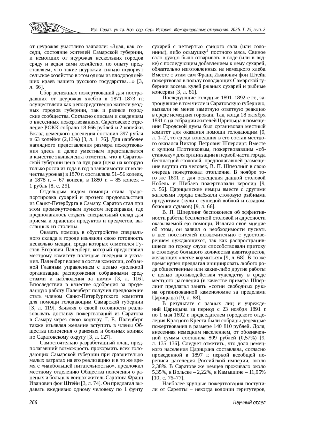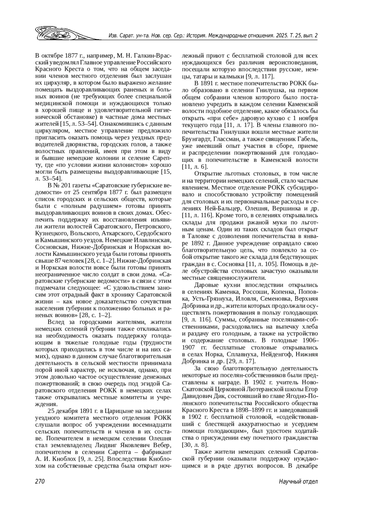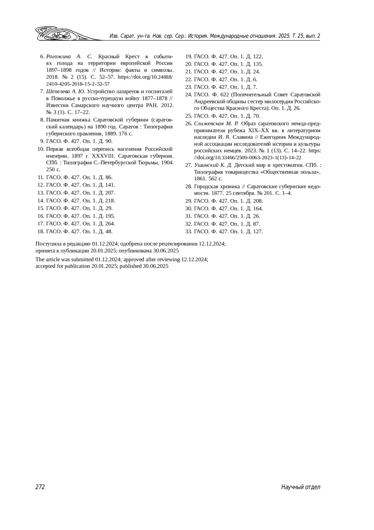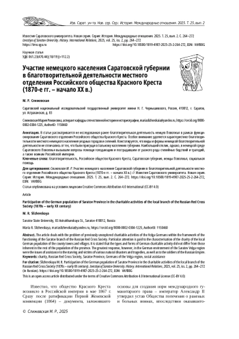 СЛИЖЕВСКАЯ М. Р. УЧАСТИЕ НЕМЕЦКОГО НАСЕЛЕНИЯ САРАТОВСКОЙ ГУБЕРНИИ В БЛАГОТВОРИТЕЛЬНОЙ ДЕЯТЕЛЬНОСТИ МЕСТНОГО ОТДЕЛЕНИЯ РОССИЙСКОГО ОБЩЕСТВА КРАСНОГО КРЕСТА (1870-Е ГГ. - НАЧАЛО XX В.) // ИЗВЕСТИЯ САРАТОВСКОГО УНИВЕРСИТЕТА. НОВАЯ СЕРИЯ. СЕРИЯ: ИСТОРИЯ. МЕЖДУНАРОДНЫЕ ОТНОШЕНИЯ. 2025. Т. 25 № 2