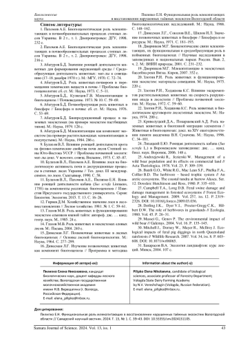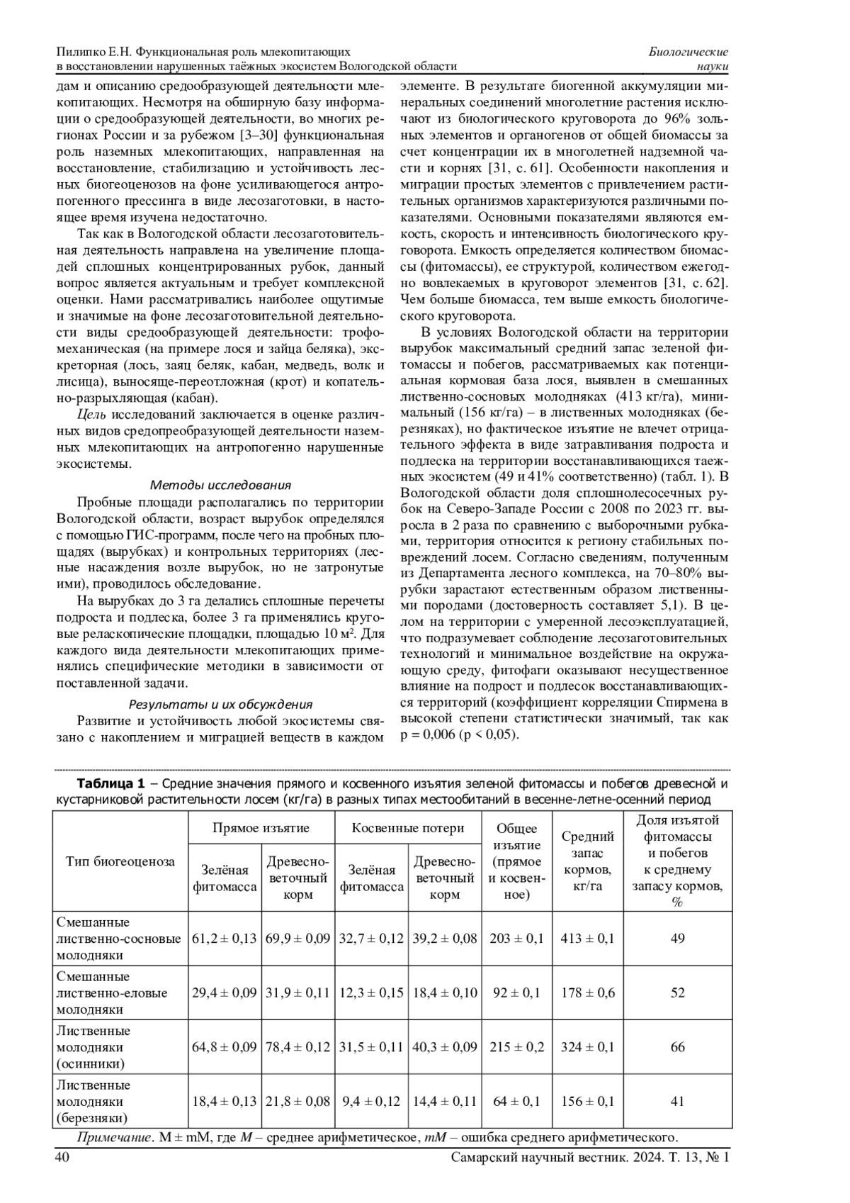 ПИЛИПКО Е. Н. ФУНКЦИОНАЛЬНАЯ РОЛЬ МЛЕКОПИТАЮЩИХ В ВОССТАНОВЛЕНИИ НАРУШЕННЫХ ТАЁЖНЫХ ЭКОСИСТЕМ ВОЛОГОДСКОЙ ОБЛАСТИ // САМАРСКИЙ НАУЧНЫЙ ВЕСТНИК. 2024. ТОМ 13, № 1