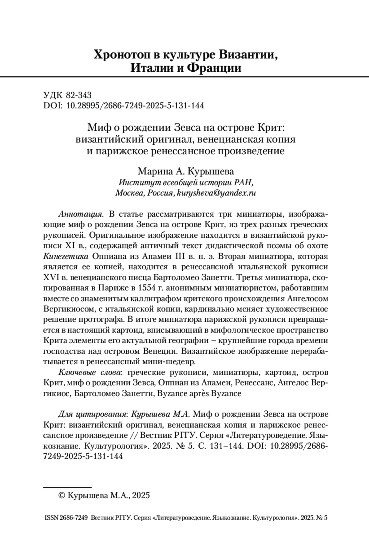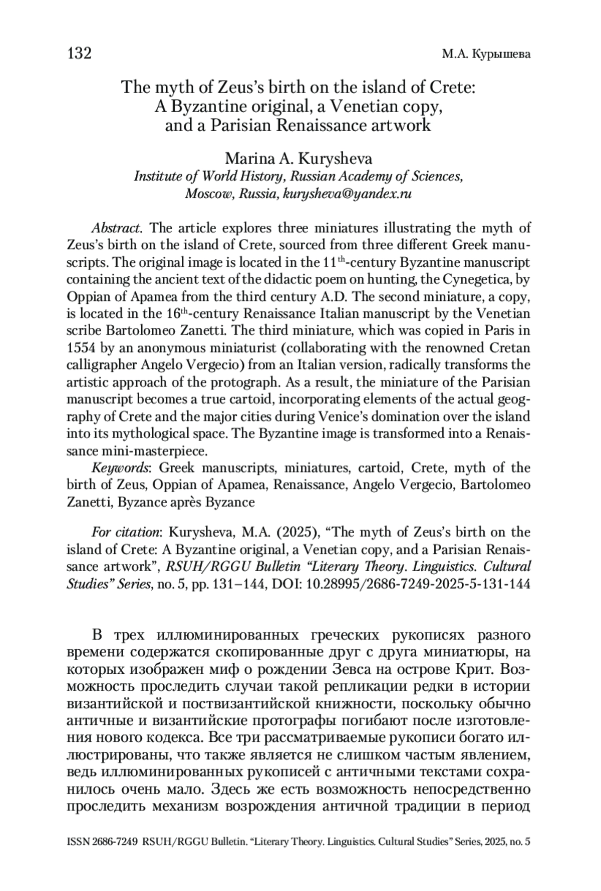 В статье рассматриваются три миниатюры, изображающие миф о рождении Зевса на острове Крит, из трех разных греческих рукописей. Оригинальное изображение находится в византийской рукописи XI в., содержащей античный текст дидактической поэмы об охоте Кинегетика Оппиана из Апамеи III в. н. э. Вторая миниатюра, которая является ее копией, находится в ренессансной итальянской рукописи XVI в. венецианского писца Бартоломео Занетти. Третья миниатюра, скопированная в Париже в 1554 г. анонимным миниатюристом, работавшим вместе со знаменитым каллиграфом критского происхождения Ангелосом Вергикиосом, с итальянской копии, кардинально меняет художественное решение протографа. В итоге миниатюра парижской рукописи превращается в настоящий картоид, вписывающий в мифологическое пространство Крита элементы его актуальной географии – крупнейшие города времени господства над островом Венеции. Византийское изображение перерабатывается в ренессансный мини-шедевр.