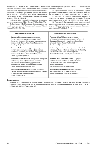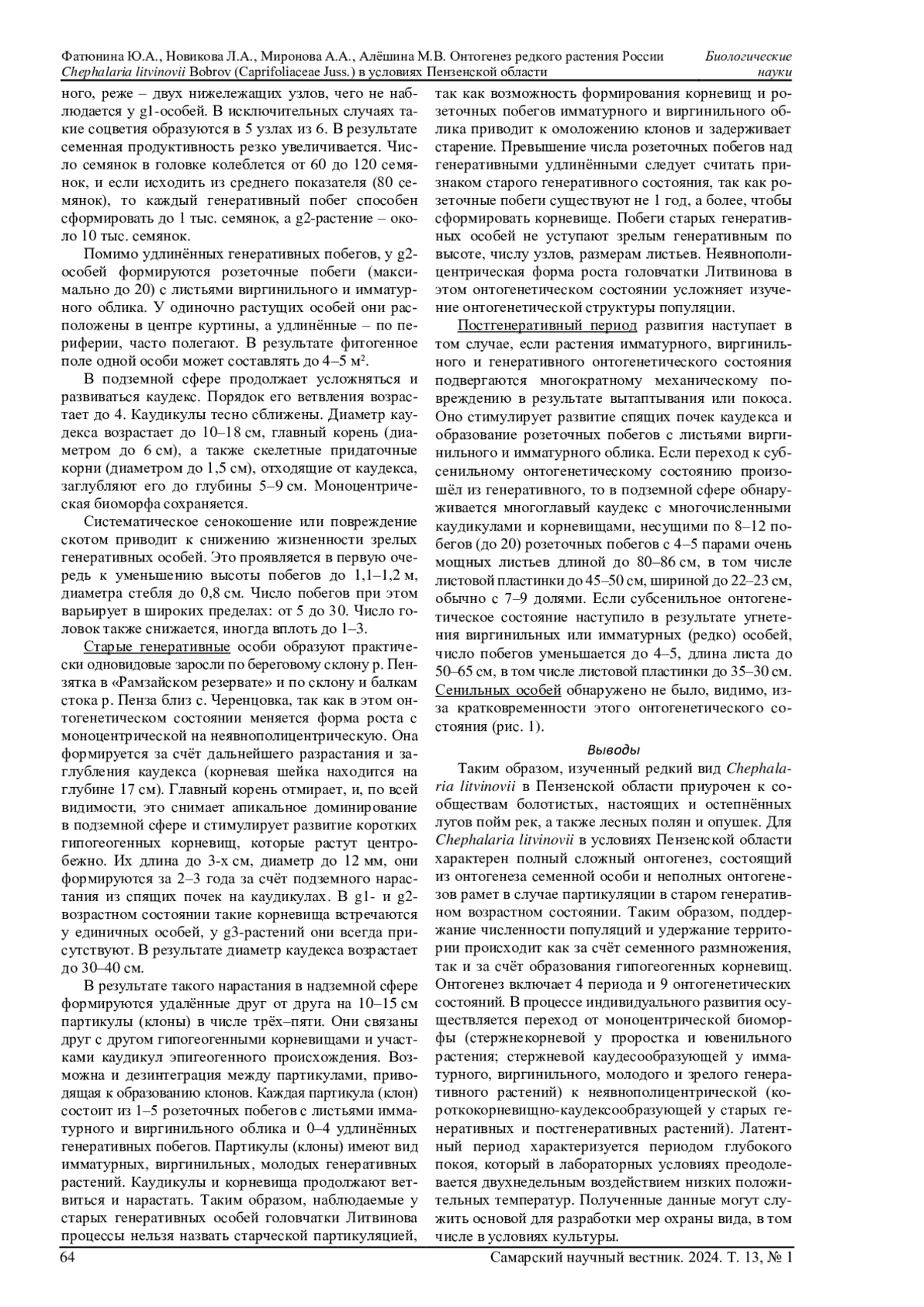 ФАТЮНИНА Ю. А., НОВИКОВА Л. А., МИРОНОВА А. А., АЛЁШИНА М. В. ОНТОГЕНЕЗ РЕДКОГО РАСТЕНИЯ РОССИИ CHEPHALARIALITVINOVII BOBROV (CAPRIFOLIACEAE JUSS.) В УСЛОВИЯХ ПЕНЗЕНСКОЙ ОБЛАСТИ // САМАРСКИЙ НАУЧНЫЙ ВЕСТНИК. 2024. ТОМ 13, № 1