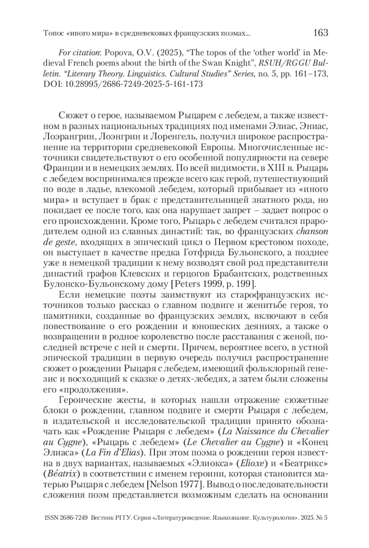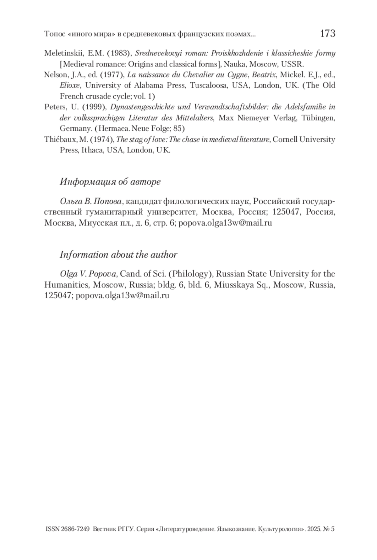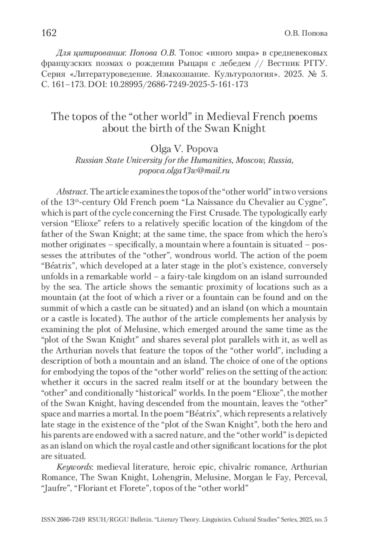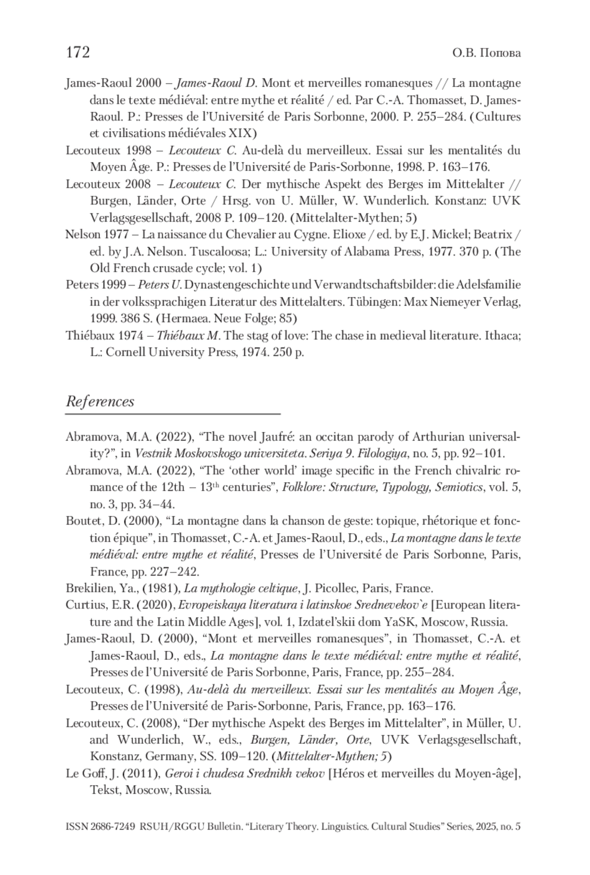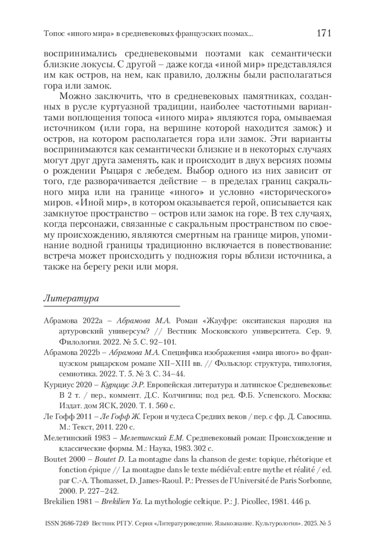2. Абрамова 2022b - Абрамова М.А. Специфика изображения «мира иного» во французском рыцарском романе XII-XIII вв. // Фольклор: структура, типология, семиотика. 2022. Т. 5. № 3. С. 34-44.