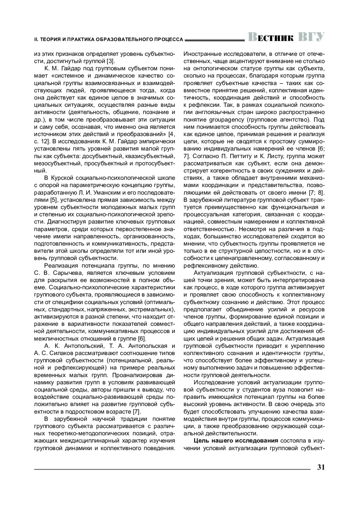 Статья: АКТУАЛИЗАЦИЯ ГРУППОВОЙ СУБЪЕКТНОСТИ У СТУДЕНТОВ-ПСИХОЛОГОВ В УСЛОВИЯХ ОБРАЗОВАТЕЛЬНОЙ СРЕДЫ ВУЗА (2025)