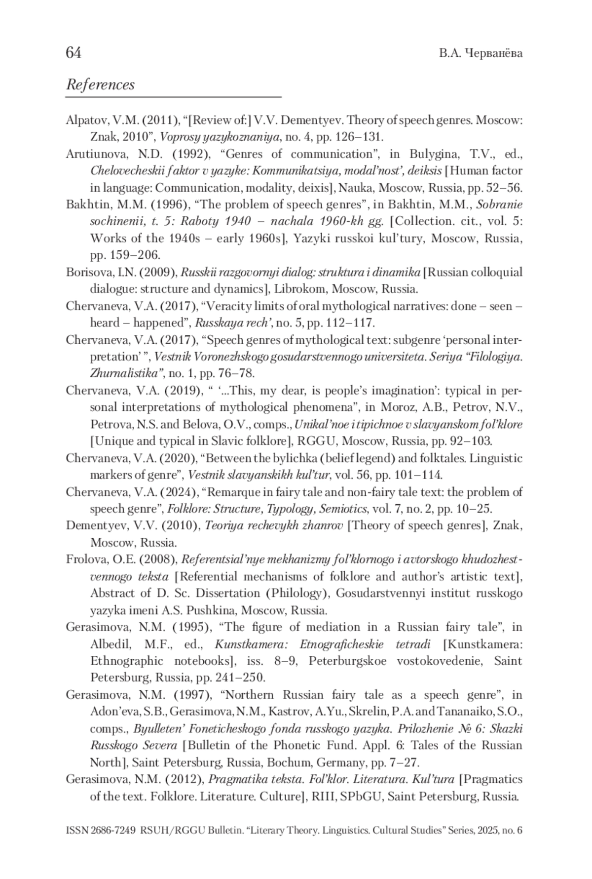 26. Черванёва 2024 - Черванёва В.А. Ремарка в сказочном и несказочном тексте: проблема речевого жанра // Фольклор: структура, типология, семиотика. 2024. Т. 7. № 2. С. 10-25.