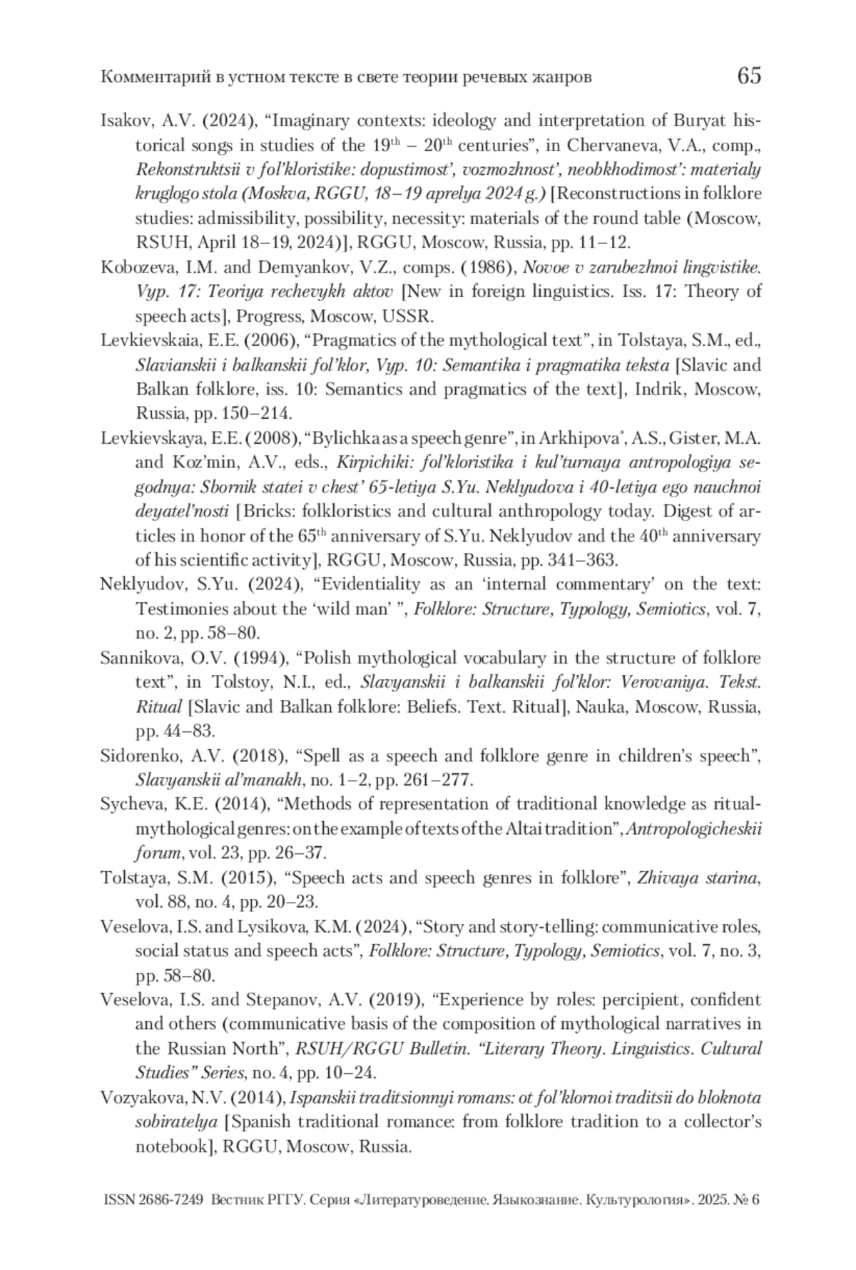 6. Веселова, Степанов 2019 - Веселова И.С., Степанов А.В. Опыт по ролям: перципиент, конфидент и другие (коммуникативные основы композиции мифологических нарративов Русского Севера) // Вестник РГГУ. Серия «Литературоведение. Языкознание. Культурология». 2019. № 4. С. 10-24.