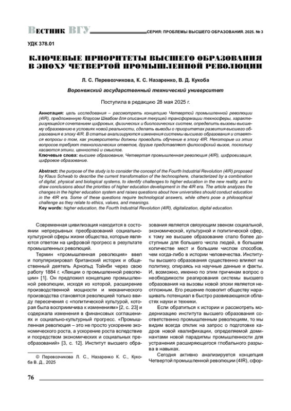 Цель исследования - рассмотреть концепцию Четвертой промышленной революции (4IR), предложенную Клаусом Швабом для описания текущей трансформации техносферы, характеризующейся сочетанием цифровых, физических и биологических систем, определить вызовы высшему образованию в условиях новой реальности, сделать выводы о приоритетах развития высшего образования в эпоху 4IR. В статье анализируются изменения системы высшего образования и ставятся вопросы о том, как университеты должны проводить обучение в эпоху 4IR. Некоторые из этих вопросов требуют технологических ответов, другие представляют философский вызов, поскольку касаются этики, ценностей и смыслов.